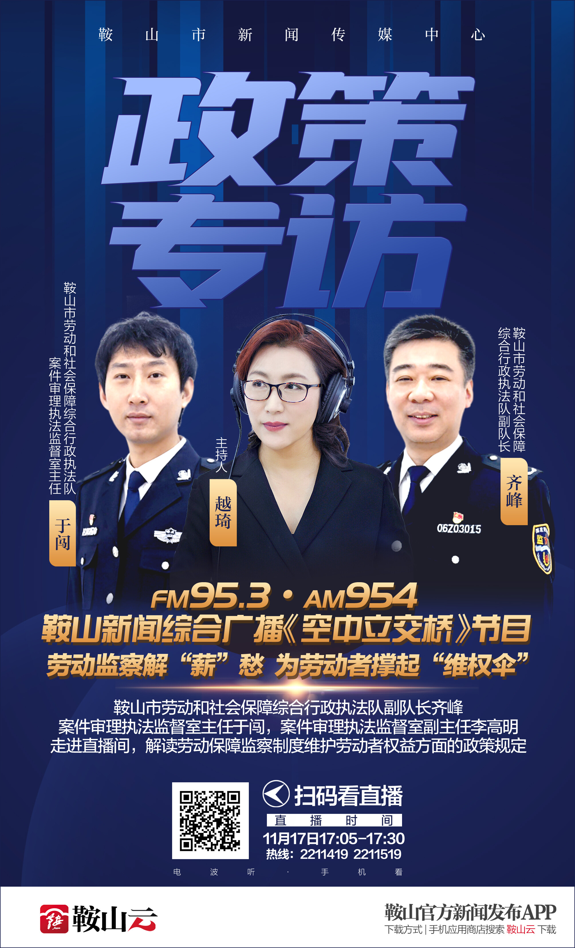 什么是劳动监察?劳动监察如何保障劳动者的权益?劳动者遇到哪些难题可以直接到劳动保障监察大队投诉举报呢?17日17:05《政策专访》邀请鞍山市劳动和社会保障综合行政执法队副队长齐峰,案件审理执法监督室主任于闯,案件审理执法监督室副主任李高明走进直播间,解读劳动保障监察制度维护劳动者权益方面的政策规定。届时继续开通直播间热线电话2211419 2211519回应听众的疑虑和问询。欢迎锁定FM95.3、AM954鞍山新闻综合广播收听节目,更可以打开手机鞍山云APP收看视频直播。广播视频化,好声音看得见!