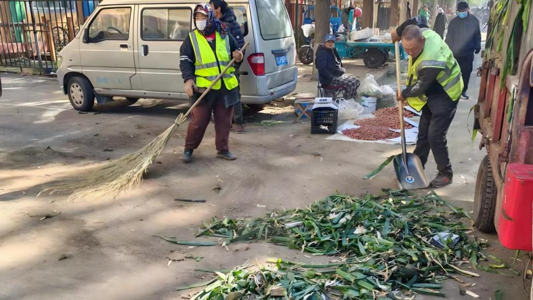 针对秋菜销售产生的菜叶与秋季落叶“两叶”清理难题,市城管局启动“伴随保洁、即时清理”模式。在各秋菜销售点位及周边区域,通过增派保洁力量、延长作业时长、加密垃圾收运频次等措施,确保菜叶、树叶等废弃物随产随清、日产日清。对大树密集的售卖点位及落叶集中路段,加大清扫力度,推行“两叶通扫”机制,采用“人工清扫+机械作业”协同模式,充分发挥机械化清扫效率高、覆盖面广的优势,全面提升环境保洁质量,持续维护城市洁净面貌。