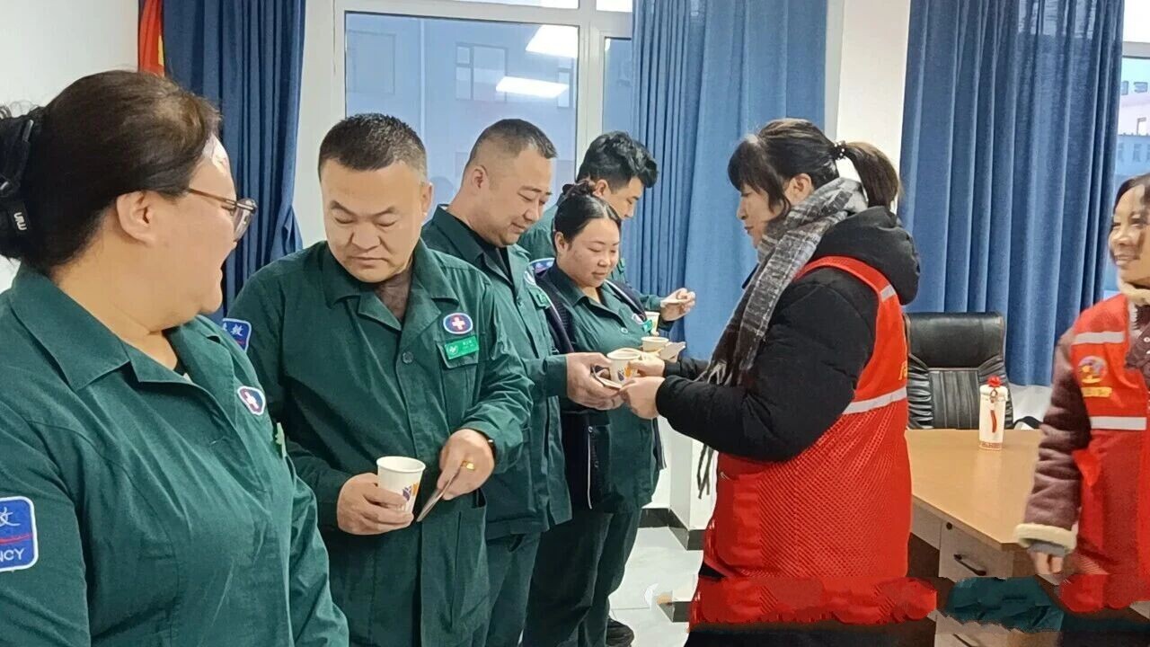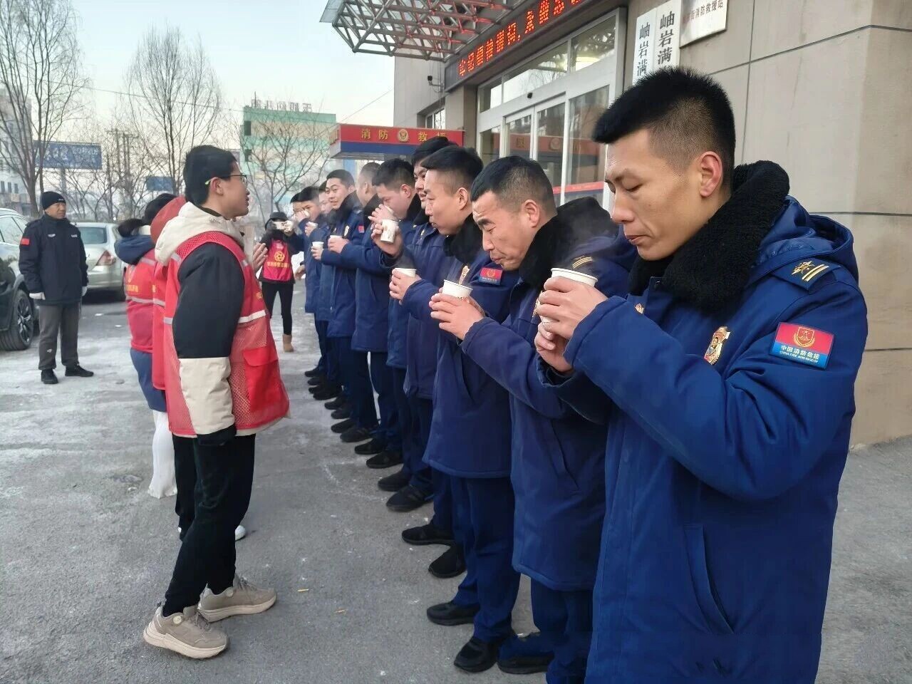 当天清晨6:30,志愿者们准时在学之助教培中心集合。活动开始前,各组已提前两个小时精心熬制姜茶,伴随着全体志愿者响亮喊出活动口号:“拥警爱民暖冬行,一杯姜茶见真情”,正式启动温暖之行。随后各小组的青年志愿者按计划前往几个慰问点,在岫岩公安局巡特警大队门前,志愿者们为执勤民警送上热姜茶,感谢他们守护城市平安;环卫工作站中,在寒风中劳动的环卫工人接过姜茶,脸上绽开笑容;岫岩中心医院120急救中心值守的医护人员,在忙碌间也能喝上一口热茶;在负责当地供暖的恒源热力公司,供暖工人们双手接过姜茶润了润被炉火和烟灰呛得说不话的嗓子;岫岩消防救援大队内,无论是备勤消防员还是执勤车组,都收到了来自志愿者们的新年第一杯热姜茶。
