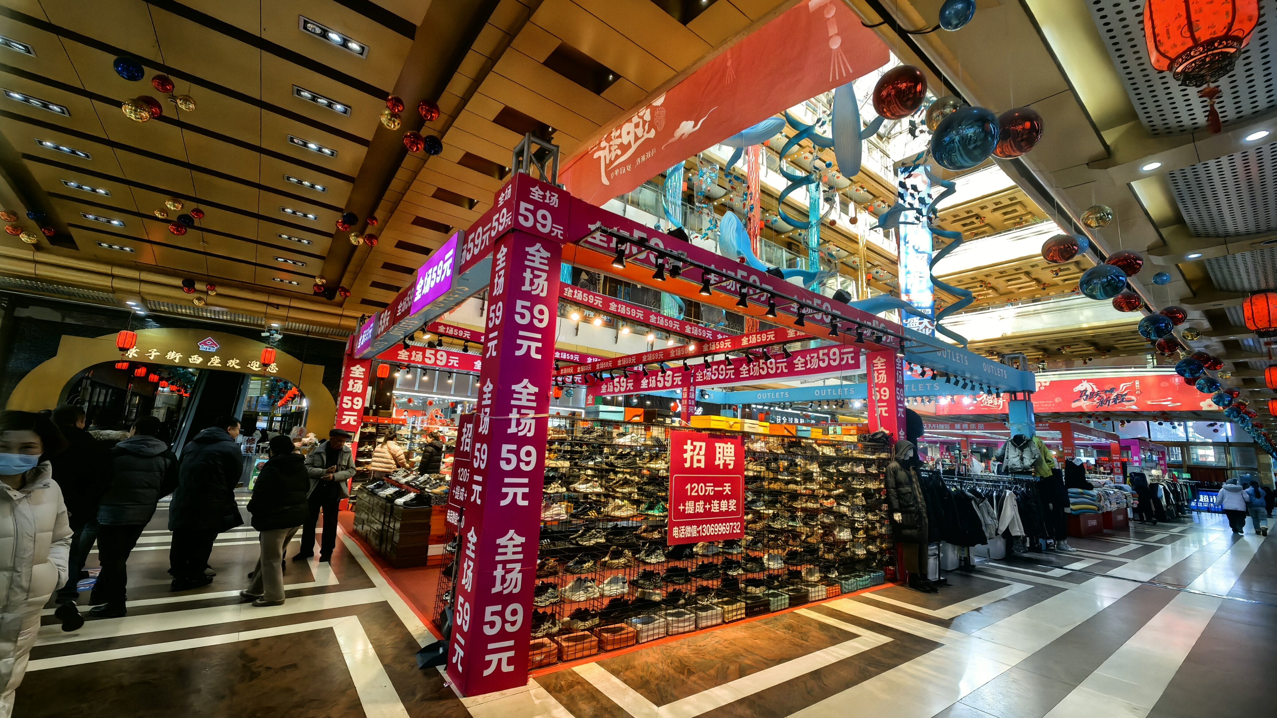 步入商场主通道,一串串红灯笼沿着廊顶蜿蜒延伸,从入口一直垂挂到街区深处,朱红的灯身搭配金色流苏,在灯光下折射出温暖的光泽。马年主题的红色条幅则巧妙穿插其间,“金鞍贺岁,龙马精神”“马到成功迎新春”等吉祥标语醒目亮眼,既呼应了丙午马年的生肖主题,又传递出对新年的美好期许。