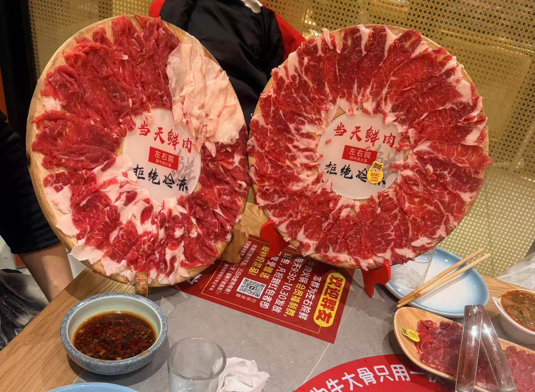 这家火锅店的负责人李先生向记者介绍了坚守品质的秘诀:“我家只卖鲜牛肉、鲜羊肉,一天会宰两遍牛,上午下午各一次,确保每一盘肉都是当天的新鲜货。”为了实现“零库存”,避免食材积压影响品质,门店推出了特色优惠:“晚上七点半之后,肉品打三八折,就是为了把当天的肉都卖掉,绝不留到第二天。”据悉,门店每一百斤鲜牛肉会剔除20~30斤边角料,只为保证上桌肉质的纯粹口感,即便成本偏高,仍坚持亲民定价,凭借薄利多销赢得复购。除了核心的鲜切肉,门店还配套了矿泉水锅底、免费果茶、小拌菜和水果,以及桌桌必点的牛腩饭等特色品类,形成集涮品、主食于一体的火锅综合体。