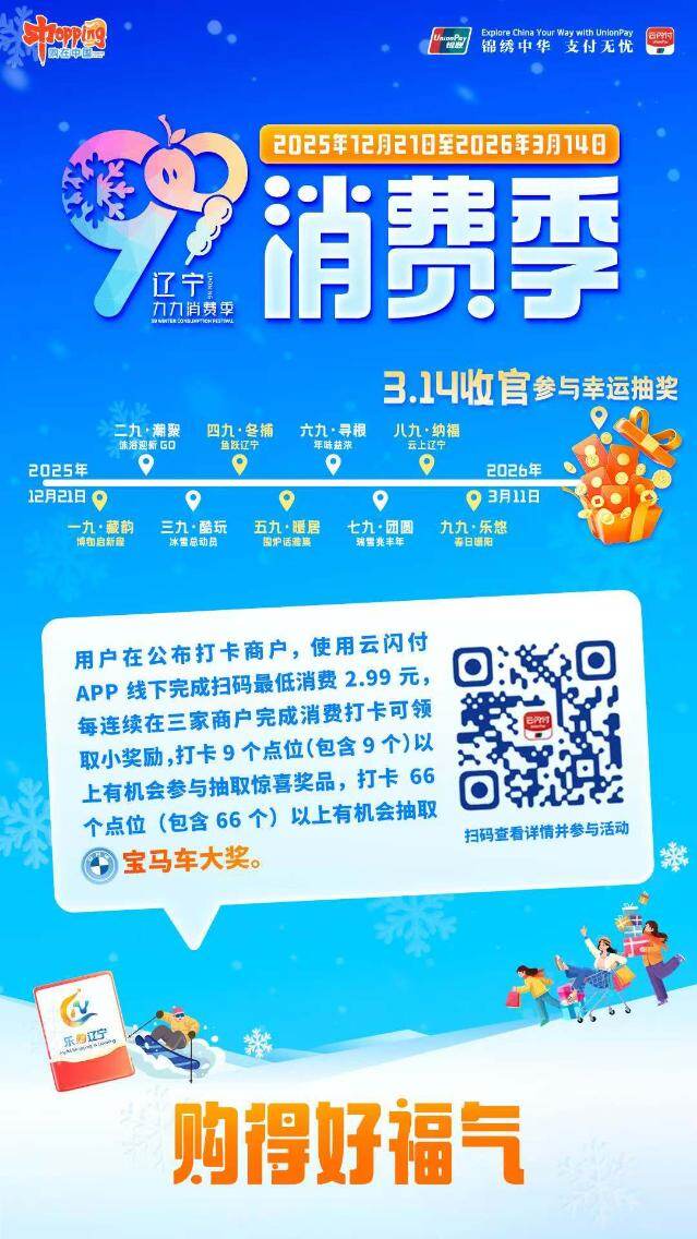 辽宁“九九消费季”设一九·藏韵、三九·酷玩等九大主题阶段,2025年12月21日至2026年3月14日期间,市民通过云闪付线下消费满2.99元即可打卡,连续3家打卡领小奖,9个及以上点位可抽惊喜奖品,66个及以上点位有机会赢宝马车大奖。鞍山7大打卡点紧扣“9”系主题,深度融合地域特色,让市民游客在打卡消费中感受钢都冬日独特魅力,为这个冬天注入消费活力。