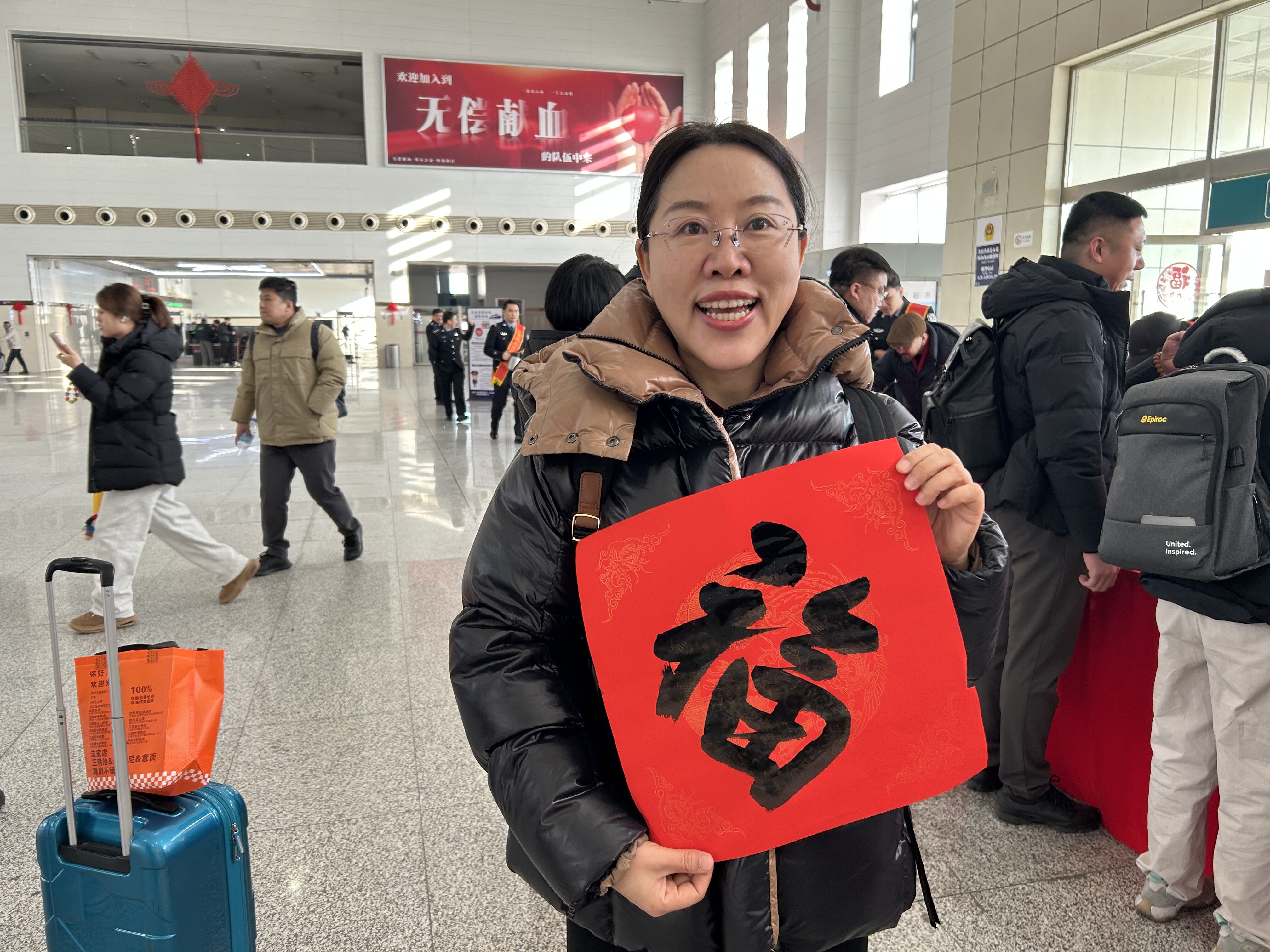上午9时,在鞍山西站的春运主题展台前,书法家们现场挥毫泼墨,一笔一划写下寓意吉祥的福字和对联,工作人员双手将这些满载新春祝福的墨宝送到候车旅客手中。旅客王女士捧着刚领到的福字笑着说:“这福字暖乎乎的,拿着它候车,连回家的路都觉得更亲切了!”这温馨一幕,是鞍山春运首日最真实的写照,也让跨越山海的归途,从一开始就充满了温情。