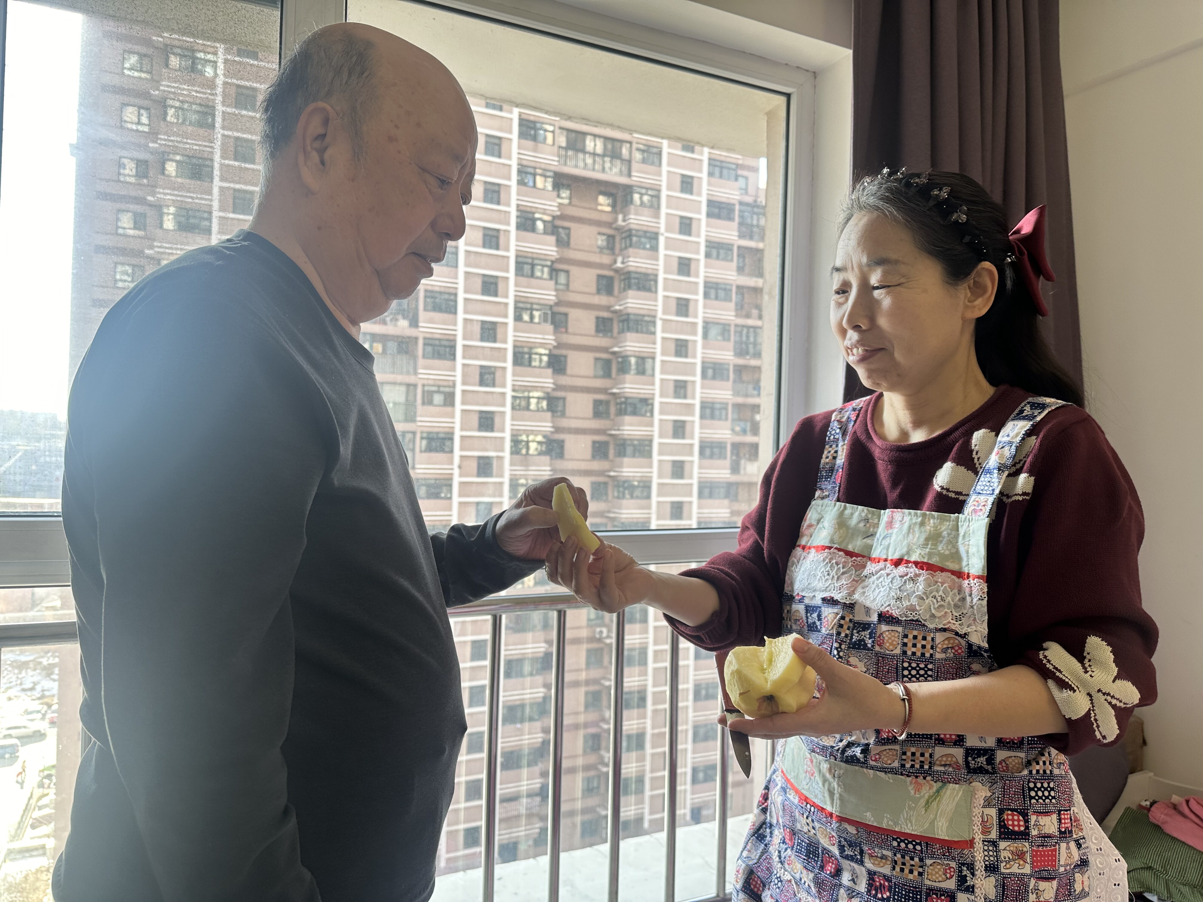 几年前,得知刘先生老两口痛失独子、深陷悲痛难以自拔,徐艳菊郑重许下承诺:“未来,我像你们的孩子一样照顾你们。”这一诺,便扛起了四年多的风雨无阻。每周上门探望是她雷打不动的习惯,陪老人唠家常解孤寂,帮着打扫房间、料理日常琐事,还常带着亲手做的馒头、花卷、豆包、饹饼等家常主食,让冷清的家里重新飘起烟火气。徐艳菊的爱人也将两位老人的难处记在心里,考虑到他们年龄大、去理发店理发不易,主动包揽了上门理发的活儿,一把剪刀、一把梳子在手,动作娴熟又轻柔,总能把老人的头发打理得干净整齐;遇上家里水龙头漏水、电源开关故障这类老两口无力解决的琐事,他更是随叫随到,拎着工具箱第一时间上门排查修理,小问题从不让老人多费心、多等待,用细致妥帖的帮扶免去老人的后顾之忧。
