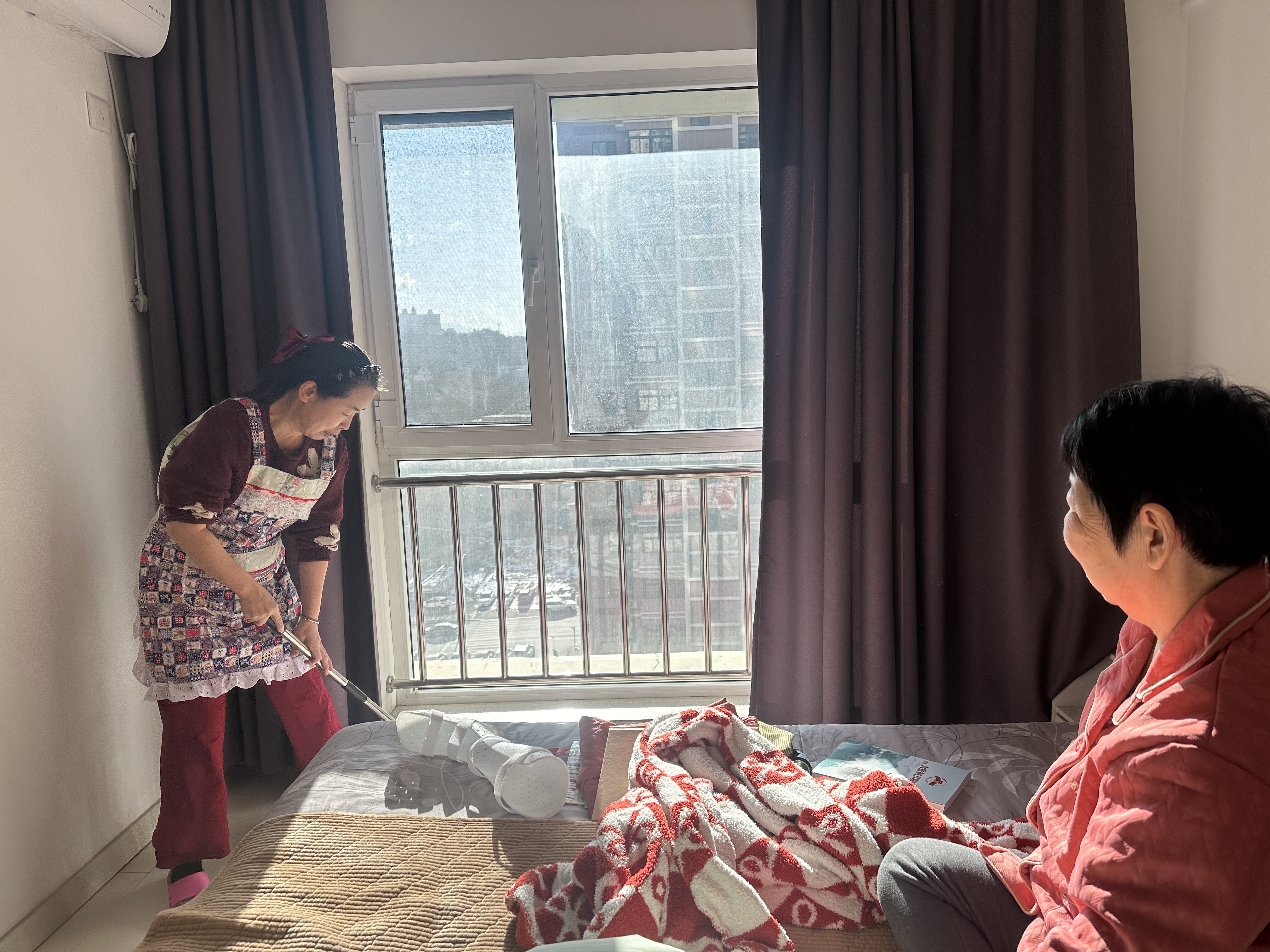 两个月前,刘先生老伴脚踝骨裂卧床静养,他本人也突发颈椎不适,生活不便的难题一下子压在了老两口身上。而徐艳菊家中还有瘫痪多年的公公需要贴身照料,双重重担落在了这个瘦弱的女人肩上,但她毫无怨言,每日在两家之间来回奔波。清晨先照料公公的饮食起居,再匆匆赶到刘先生家,小心翼翼地帮老人按摩腿部——全程托住伤处轻揉慢按,还轻声安抚缓解老人的焦躁;饮食上更是花尽心思,变着花样做馄饨、饺子、烤地瓜、蛋糕、自制面包等软糯易消化的吃食,兼顾口感与营养。她的手机24小时开机,老两口但凡有事,她总能第一时间赶到。这段艰难的日子里,徐艳菊的爱人也是如此,理发时全程放轻动作,反复询问老人是否舒适,还顺带检查了家中所有电源开关和水路,确认无安全隐患后才放心。