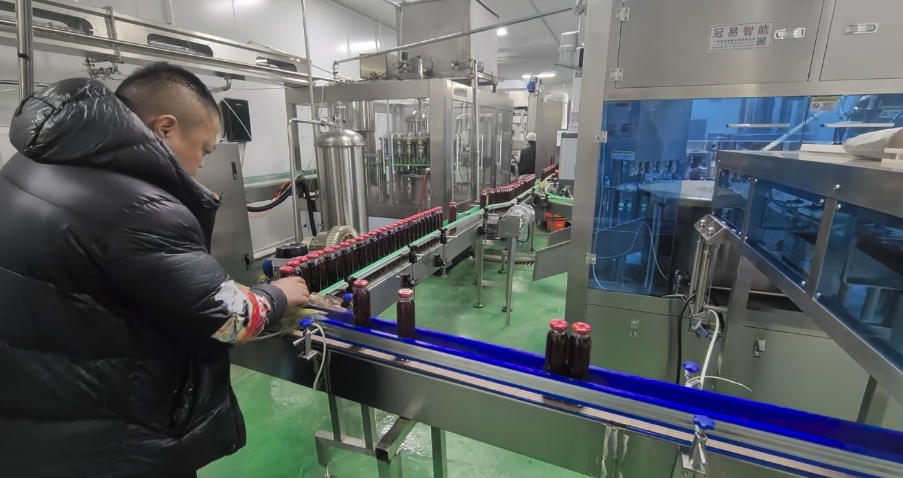 清晨的岫岩牧牛镇,寒意未消,记者走进岫岩万物生农业有限公司的生产车间看到,自动化生产线高速运转,瓶装饮料如流水般下线,工人们手脚麻利地装箱、封膜、搬运。车间外的货车前,整箱饮品正有条不紊地装车。这样连轴转的忙碌节奏,企业已坚持了近两个月。