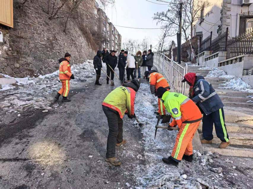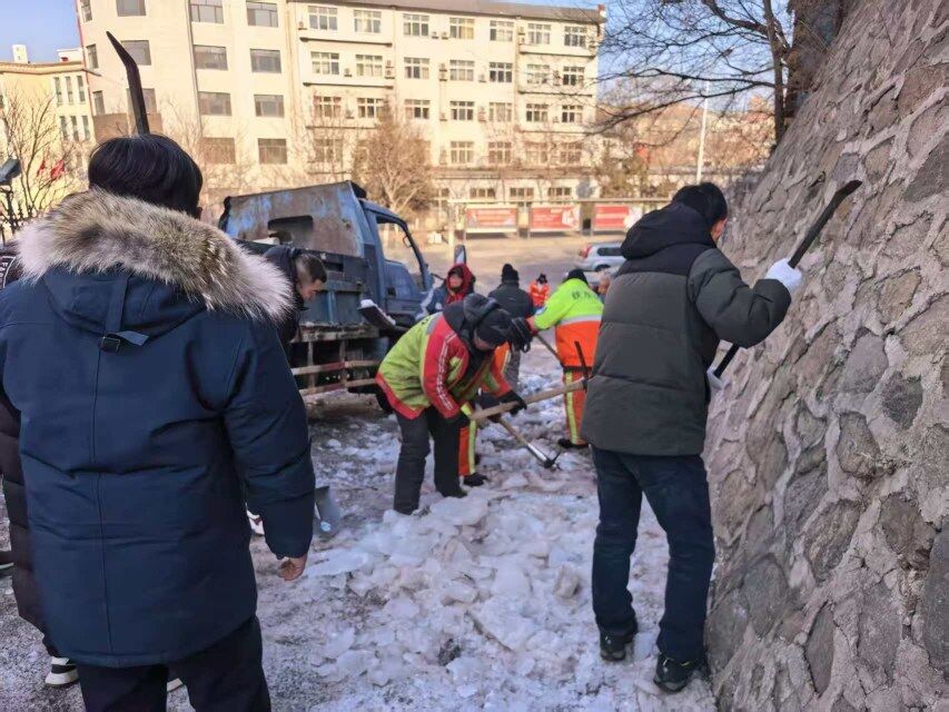 行动中,街道组织街区工作人员、环卫工人,携带破冰锤等专业工具进行除冰。工作人员采取“分段凿击、集中清运”的作业模式,先将大块积冰破碎为可清运的小块,再由环卫工人用铁锹将破碎的冰块归集至路边,最后转运至除雪专用车中统一清运。经协同作战,坡路的积冰问题得到彻底解决,道路恢复了安全通行条件。