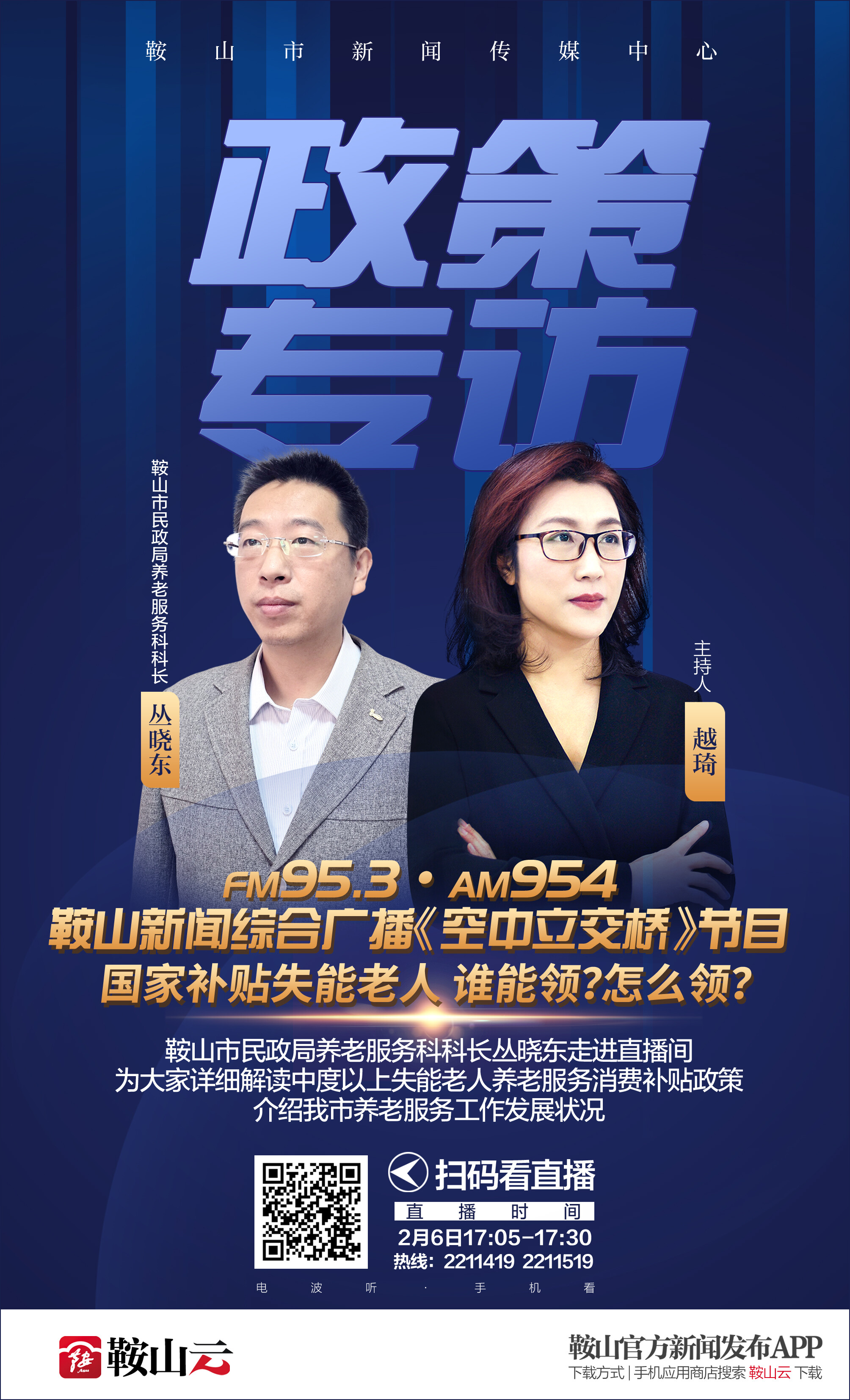 哪些人可以申请?消费券怎么领取和使用?补贴涵盖哪些服务项目?申请能力评估免费吗?6日17:05《政策专访》邀请鞍山市民政局养老服务科科长丛晓东走进直播间,为大家详细解读中度以上失能老人养老服务消费补贴政策,介绍我市养老服务工作发展状况。届时将开通直播间热线电话2211419和2211519回应您的关切。欢迎您锁定FM95.3AM954鞍山新闻综合广播收听节目,更可以打开手机鞍山云APP收看视频直播。广播视频化,好声音看得见!