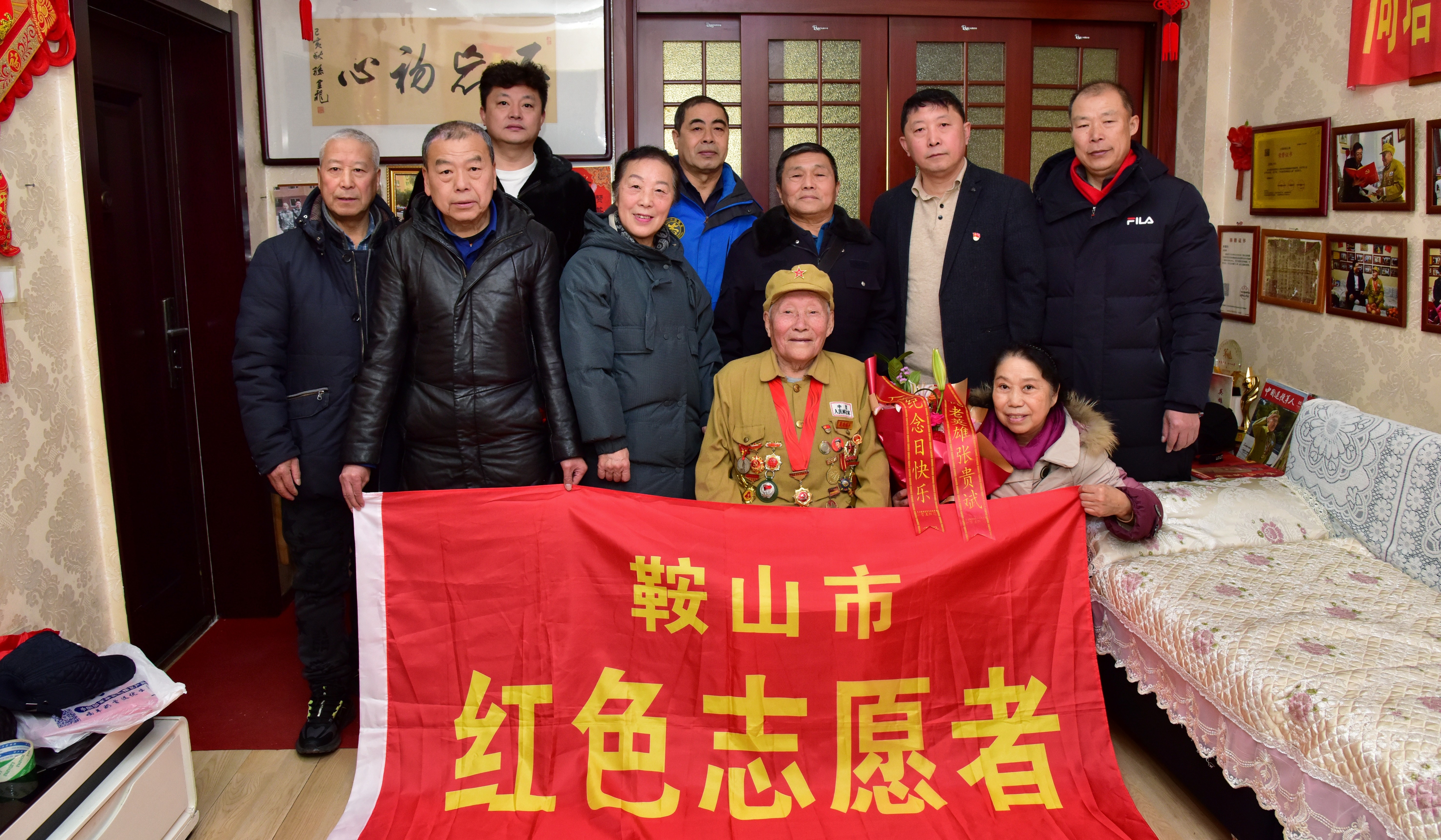 当天,红色志愿者团队一行专程到海城市,走进老英雄家中,陪他共同庆祝这个特殊又有意义的日子。室外冰寒料峭,屋内暖意融融,志愿者们向身着军装、精神矍铄的张贵斌献上鲜花,关切询问老人的身体状况与日常生活起居,表达对老英雄的崇敬与关怀。