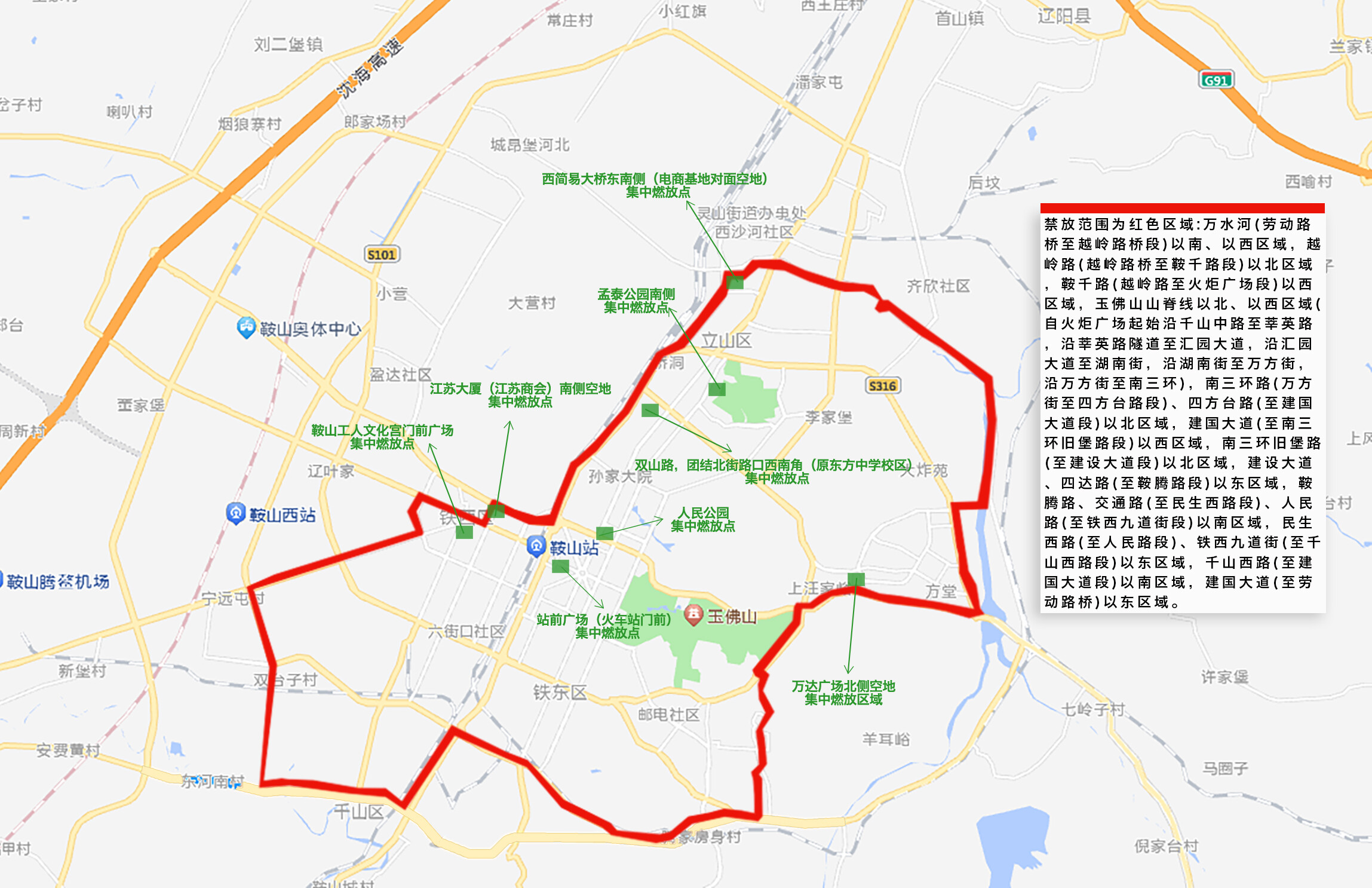 禁止燃放区域为:万水河(劳动路桥至越岭路桥段)以南、以西区域,越岭路(越岭路桥至鞍千路段)以北区域,鞍千路(越岭路至火炬广场段)以西区域,玉佛山山脊线以北、以西区域(自火炬广场沿千山中路至莘英路,沿莘英路隧道至汇园大道,沿汇园大道至湖南街,沿湖南街至万方街,沿万方街至南三环),南三环路(万方街至四方台路段)、四方台路(至建国大道段)以北区域,建国大道(至南三环旧堡路段)以西区域,南三环旧堡路(至建设大道段)以北区域,建设大道、四达路(至鞍腾路段)以东区域,鞍腾路、交通路(至民生西路段)、人民路(至铁西九道街段)以南区域,民生西路(至人民路段)、铁西九道街(至千山西路段)以东区域,千山西路(至建国大道段)以南区域,建国大道(至劳动路桥)以东区域(详见附图)。