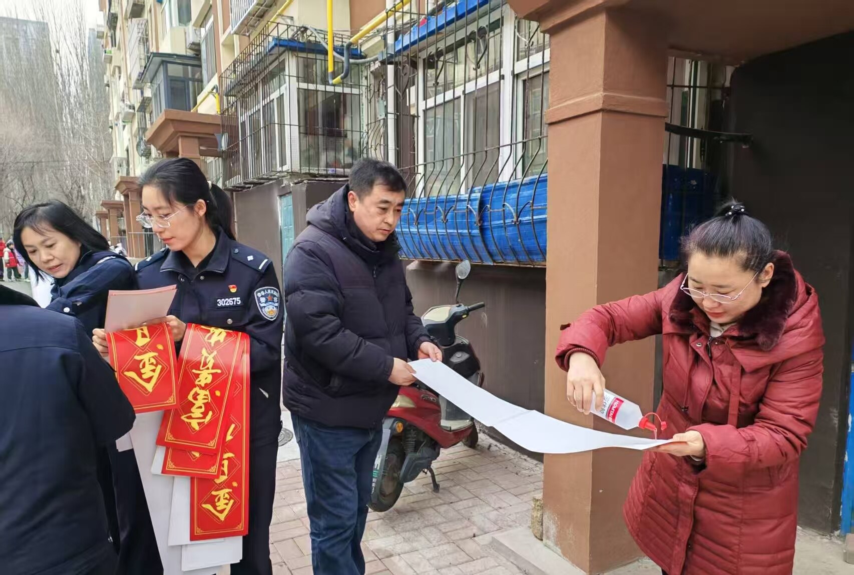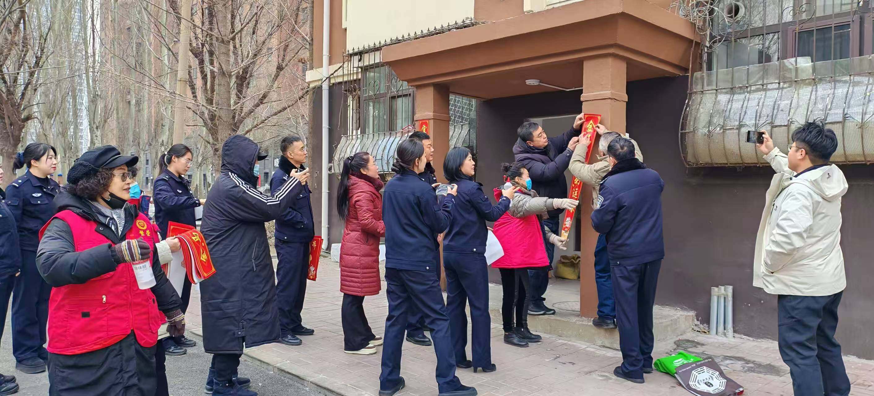 活动现场暖意融融,社区党员干部、楼长、大党委成员单位员工及居民志愿者共计60余人,身着志愿马甲,精神饱满、热情高涨。大家分工协作,踮脚、涂胶、对齐、粘贴,每一个动作都娴熟认真、一丝不苟。此次张贴的春联兼具传统韵味与马年特色,“春风得意马蹄疾,壮志凌云事业新”等吉祥词句,既饱含辞旧迎新的期许,也寄托着对居民新年的美好祝愿。经过两个多小时的忙碌,辖区300余个单元门均贴上了崭新春联,整个社区处处洋溢着欢乐喜庆、温馨和谐的节日气息,过往居民纷纷驻足称赞,感受着扑面而来的年味。