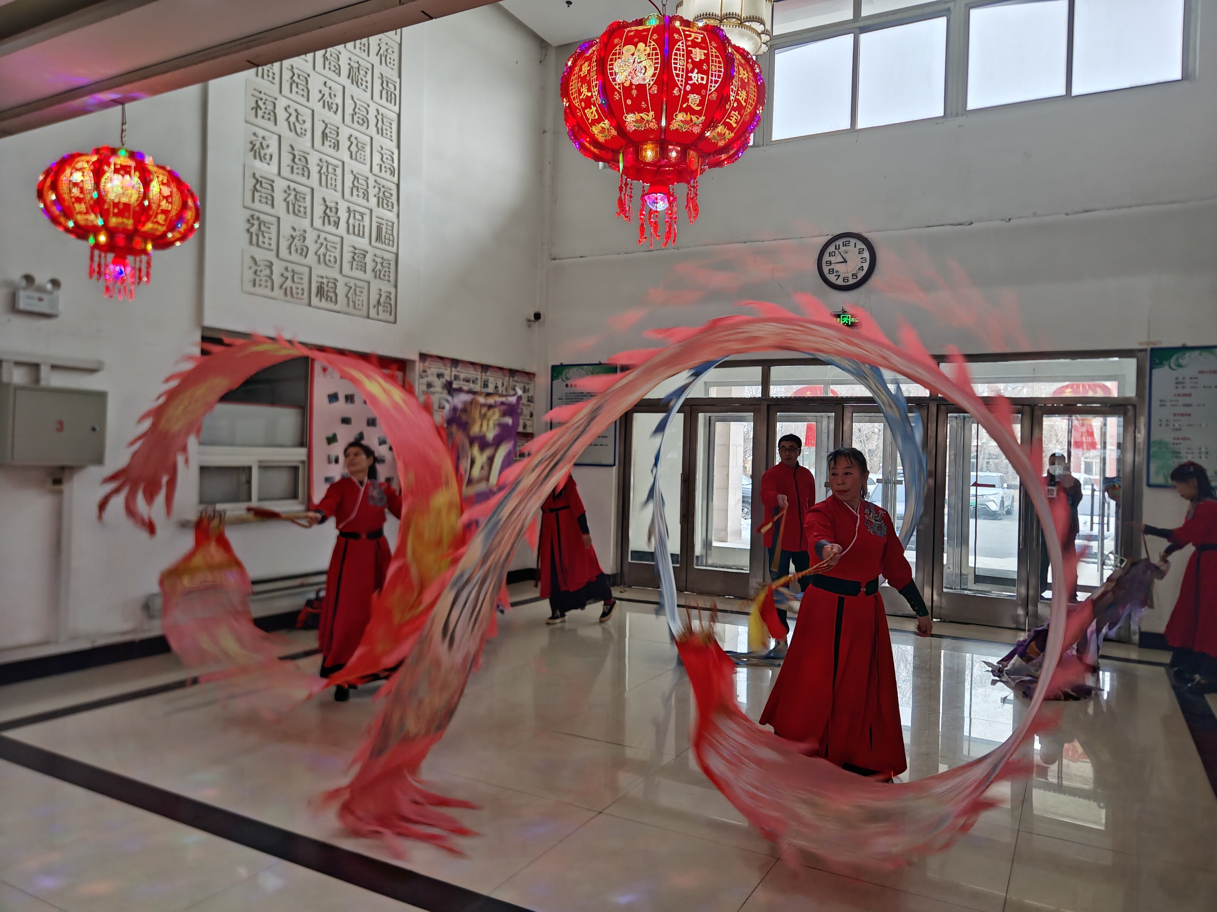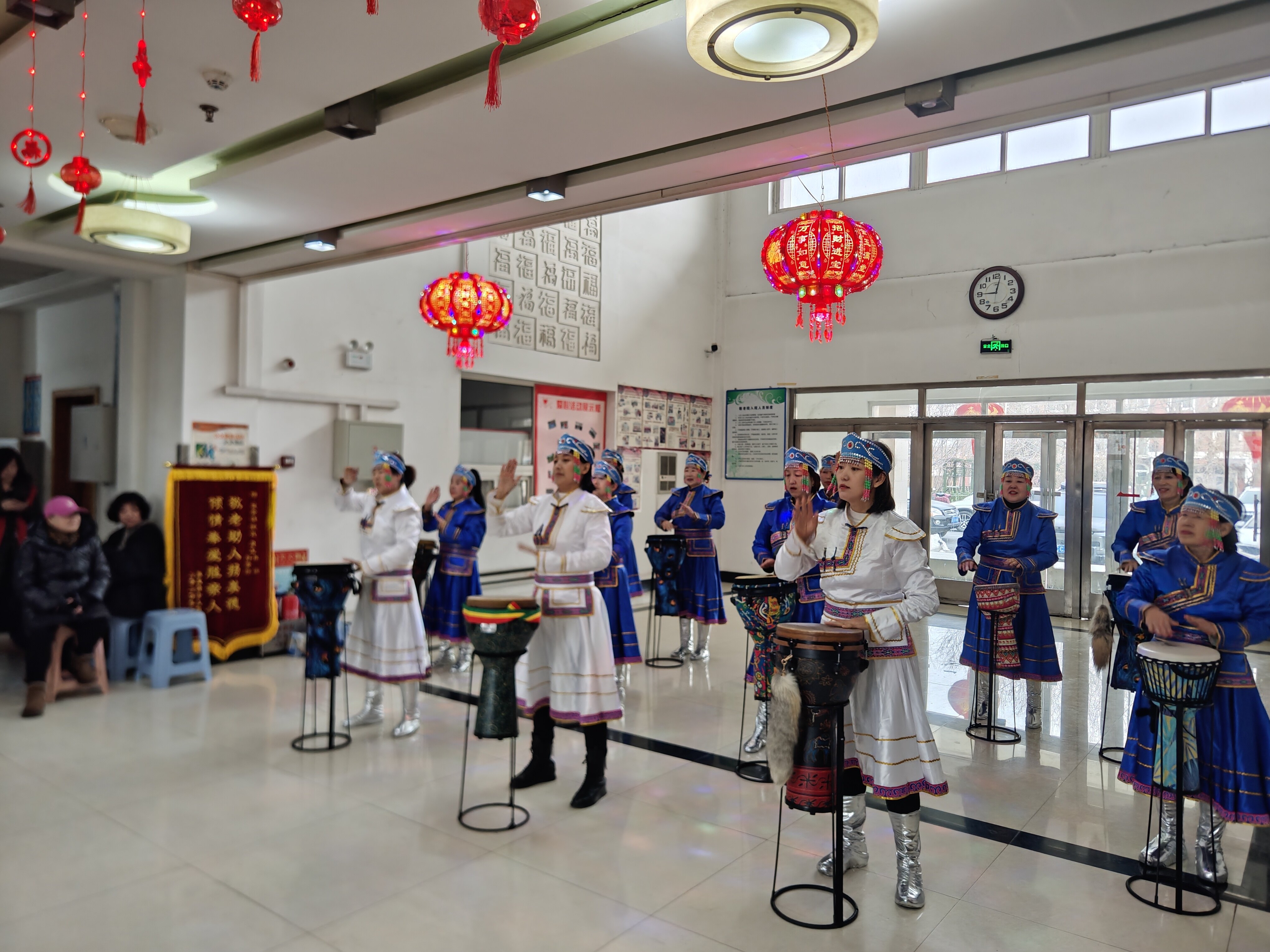 “孙师傅,年前正想找您呢!”72岁杨友财老人摸着刚理完的短发,对着镜子直点头。孙宝江笑着帮老人整理着衣服,陪老人唠着家常。大厅另一侧,志愿者和面、拌馅,巧手翻飞间,元宝似的饺子整齐码上盖帘;舞台中央,非洲鼓的欢快节奏里,一条金色长龙穿行游走,逗得老人拍红了巴掌。随着东北大秧歌的歌曲响起,大家伙带着老人扭起大秧歌,老人脸上都带着欢乐的笑容。