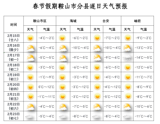 春节假期,鞍山地区平均气温较常年偏高1~2℃。15日和22日前后有两次冷空气影响我市,气温将下降5~8℃,16日和23日早晨气温较低,市区最低气温为-6~-8℃,县区为-10~-14℃。17~21日气温逐步回升,20日最高气温为9~12℃。