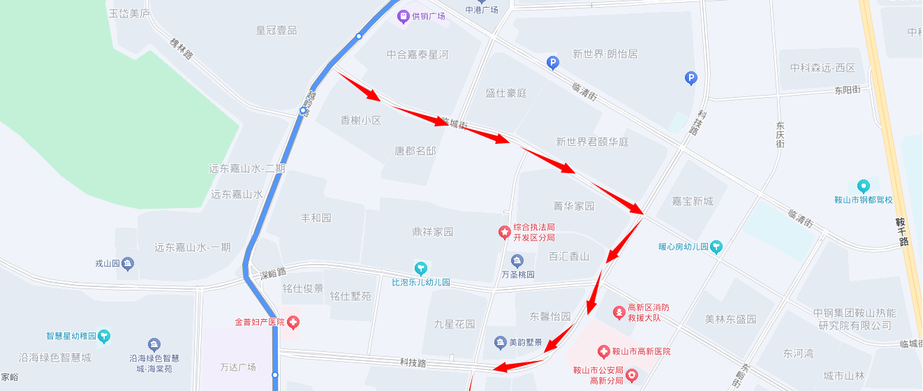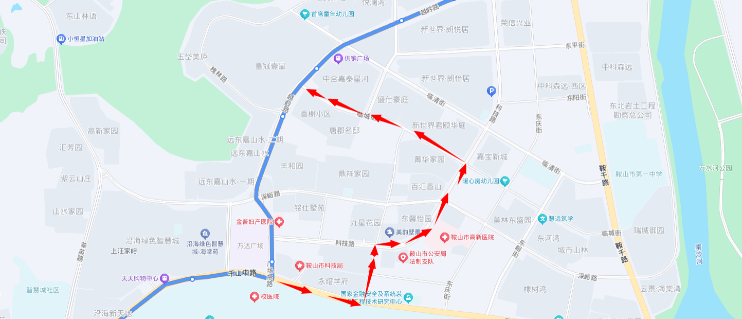 万科城东至鞍山西站方向:由越岭路与临城街交通岗左转,进入临城街,行至临城街与科技路交通岗右转,进入科技路,直行至安平街与科技路交通岗左转进入安平街然后右转进入千山中路,直行至千山中路与广场东路交通岗恢复原线。