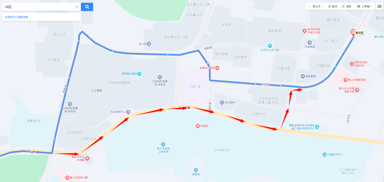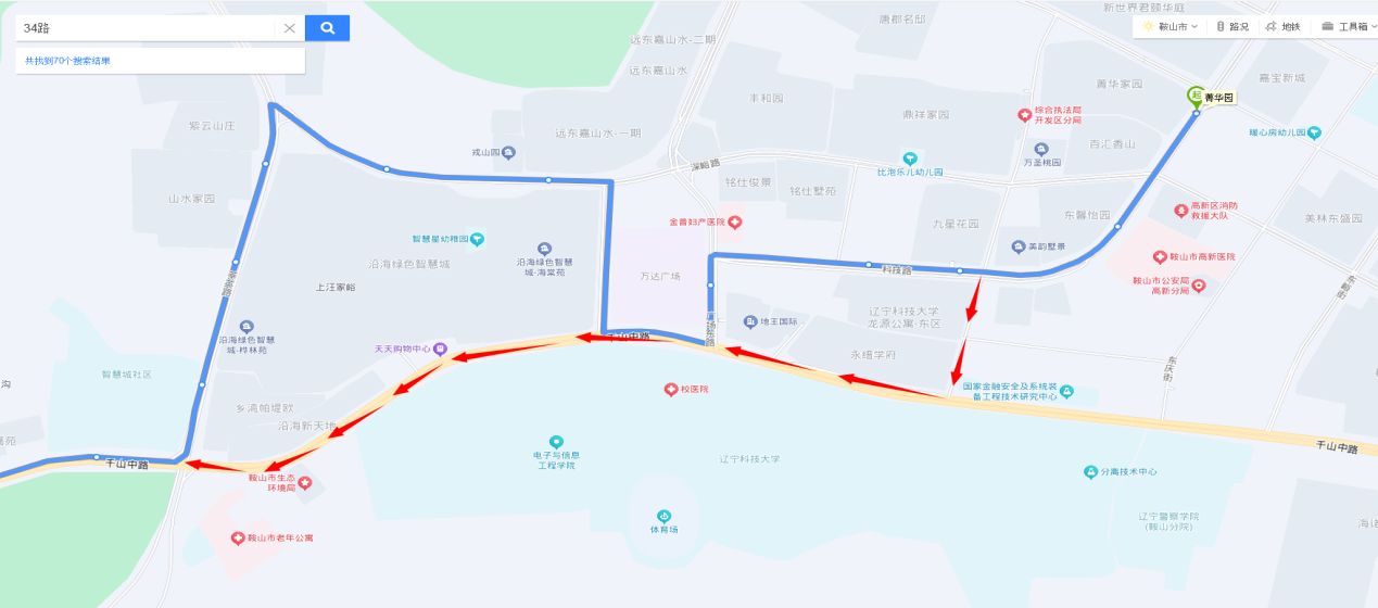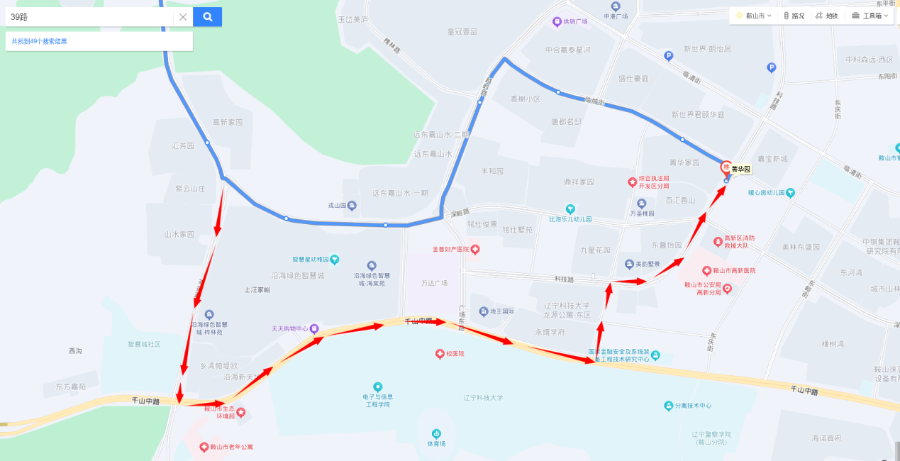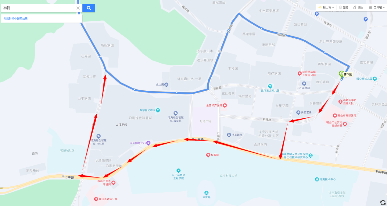 立山站至菁华园方向:由莘英路直行至千山中路与莘英路交通岗左转,进入千山中路,行至安平街与千山中路交通岗左转然后右转进入科技路,直行至菁华园终到站。