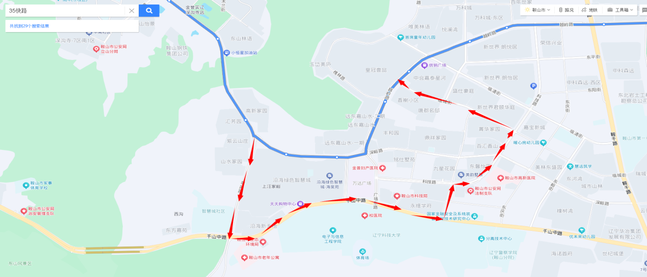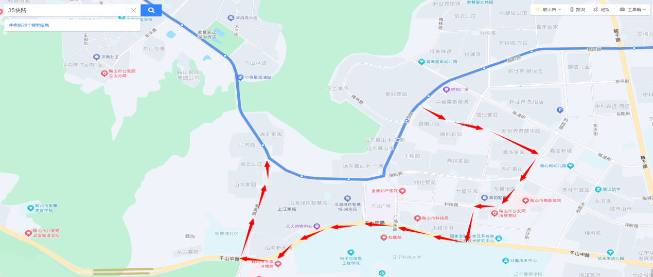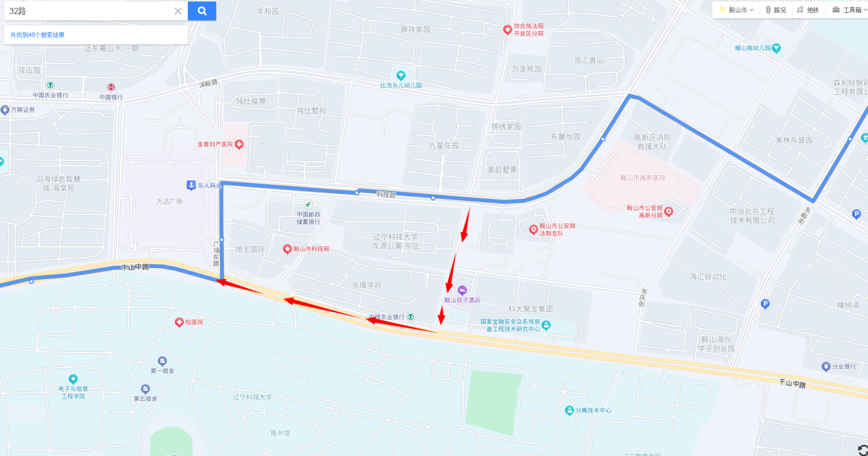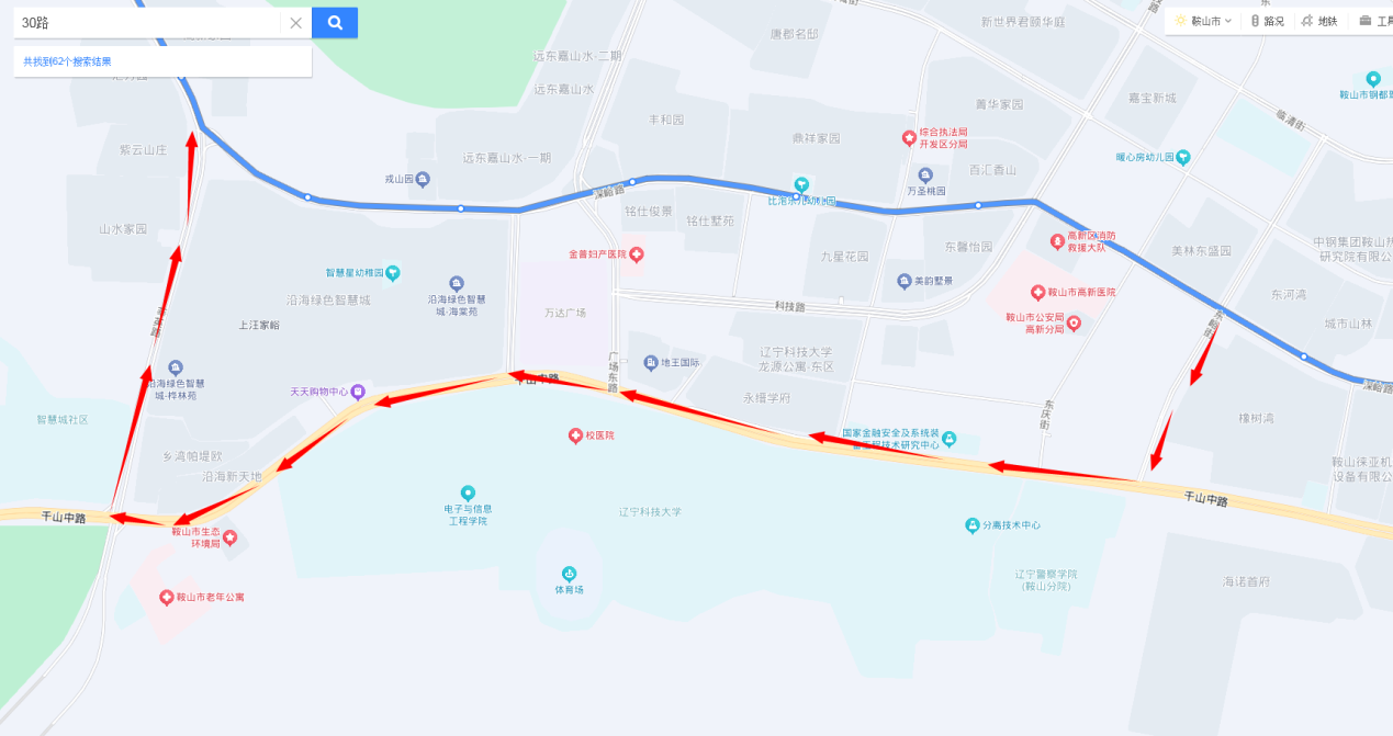 新一中至万华街方向:由科技路直行至安平街与科技路交通岗左转进入安平街然后右转进入千山中路,直行至千山中路与广场东路交通岗直行恢复原线。