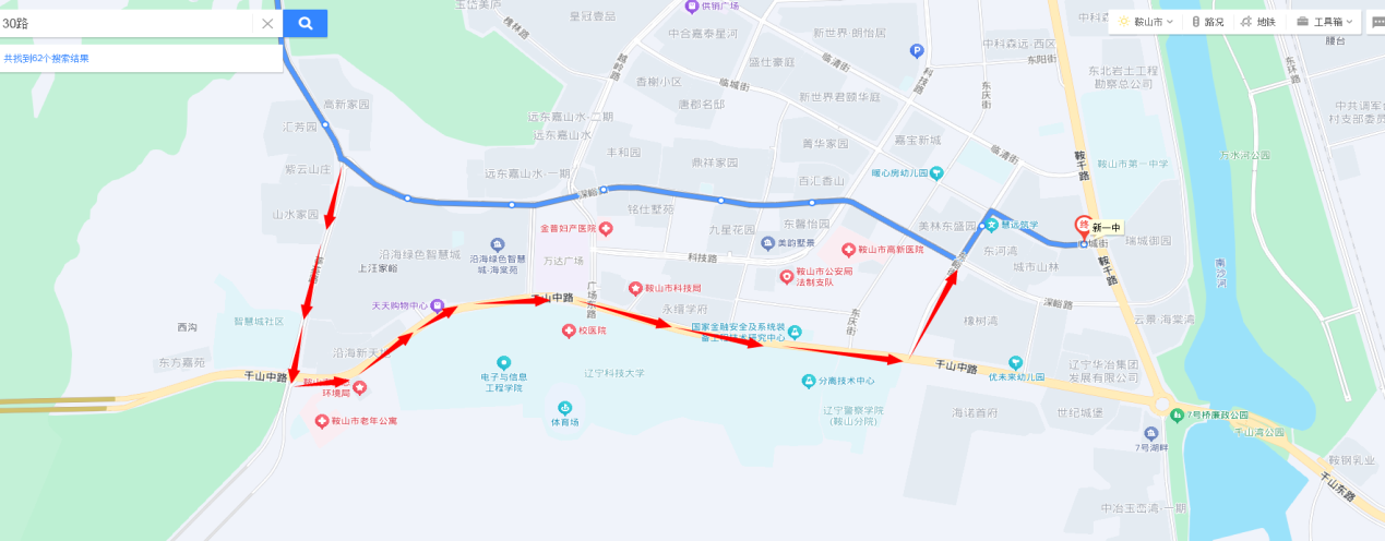 站前至新一中方向:由莘英路直行至千山中路与莘英路交通岗左转,进入千山中路,行至东峪街与千山中路交通岗左转,进入东峪街,直行恢复原线。