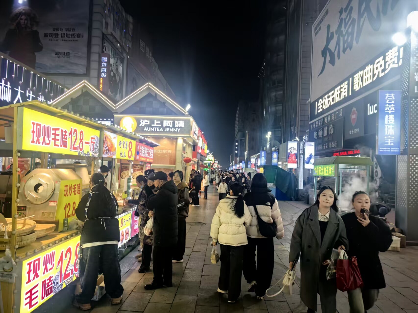 春节的脚步日益临近,气温也逐步回升,站前商圈步行街的夜晚也愈发热闹起来。霓虹招牌次第亮起,美食香气与欢声笑语交织,勾勒出一幅充满活力的新春市井画卷,也让这座城市的“年味儿”在烟火气中愈发浓厚。