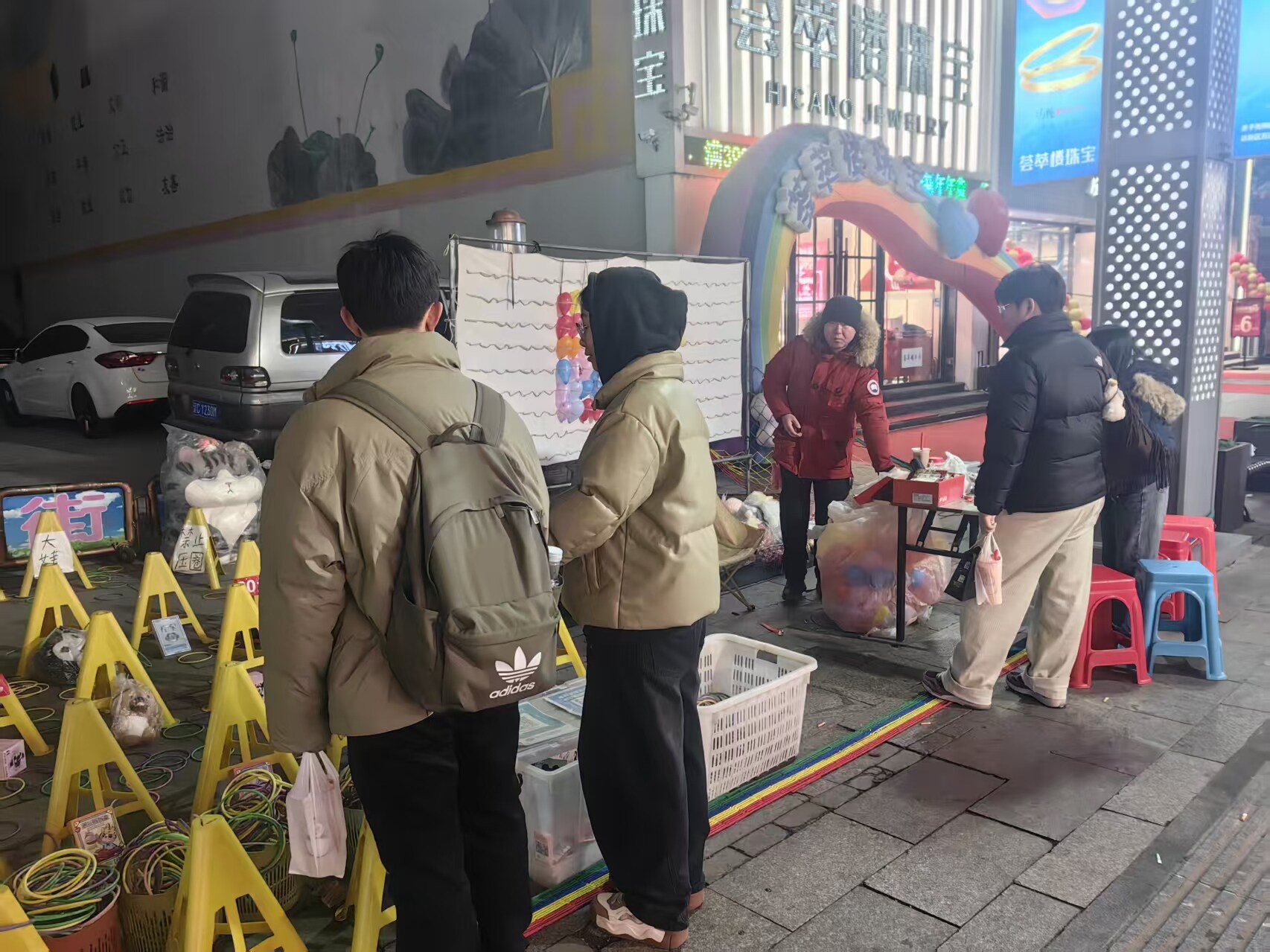 除了美食,互动娱乐与购物体验也让步行街的人气持续攀升。套圈游戏摊前,市民们驻足尝试;摆满文创小物、潮流饰品的摊位,让逛街购物多了几分惊喜。据商户介绍,近期夜间客流量明显回升,尤其是周末时段,不少家庭和年轻人结伴出行,既为置办年货,也为感受这份热闹的市井氛围。