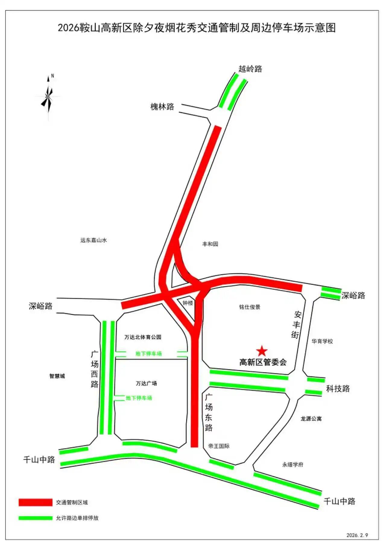 14日,记者从市公安局交通管理支队获悉,鞍山市高新区于2026年2月16日20时,在万达广场东北侧钟楼举办“焰启新程”焰火表演,为保障群众出行顺利以及活动场地周边道路交通有序、安全、畅通,根据《中华人民共和国道路交通安全法》等相关法律规定,活动期间对部分道路实施临时交通管制。