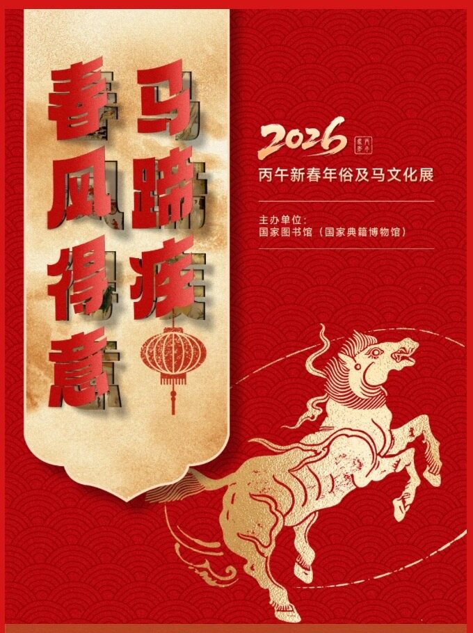 马,自古便是人类不可或缺的伙伴,更是中华民族精神图谱中的鲜活符号,成为自由吉祥的化身、坚毅奋进的象征。“春风得意马蹄疾——丙午新春年俗及马文化展”是以马文化为核心,通过丰富的呈现形式,带领读者探寻马背后的历史故事,领略“春风得意马蹄疾”的豪情诗意,感受奔腾不息的马文化精神,传递出对新一年万事顺遂、马到成功的美好祝愿。