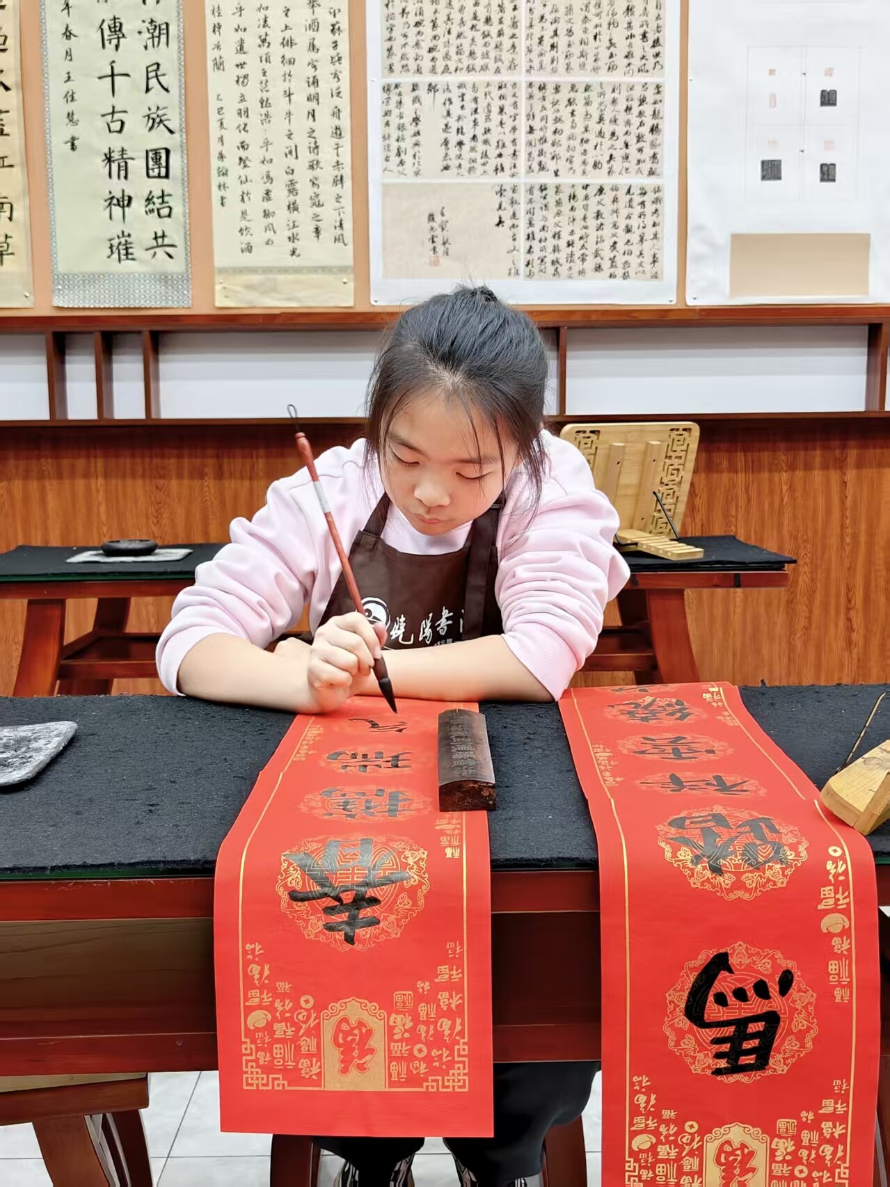 上午9点,窗外偶尔传来的鞭炮声为铁西区黎明小学学生刘钰涵的书写增添了几分节日的韵律。她手中的毛笔在红纸上稳稳游走,一个饱满的“福”字跃然眼前。在黎明小学国画书法社团的三年学习功底,让她落笔沉稳。就在前几天,她还跟着公益组织走进社区,将自己写的春联送到孤寡老人和军属家中。“看着自己写的春联贴在别人家门上,特别有成就感。”她一边说着,一边又铺开一张红纸,为自家写下春联:“神州万马争飞跃,华夏千家庆太平。”放下笔,她认真端详,轻声说:“希望我们祖国更强大,家家户户都平安。”妈妈在一旁看着,忽然发现,那个曾静不下心来的小女孩如今已能从墨香中读懂“国泰民安”的重量。