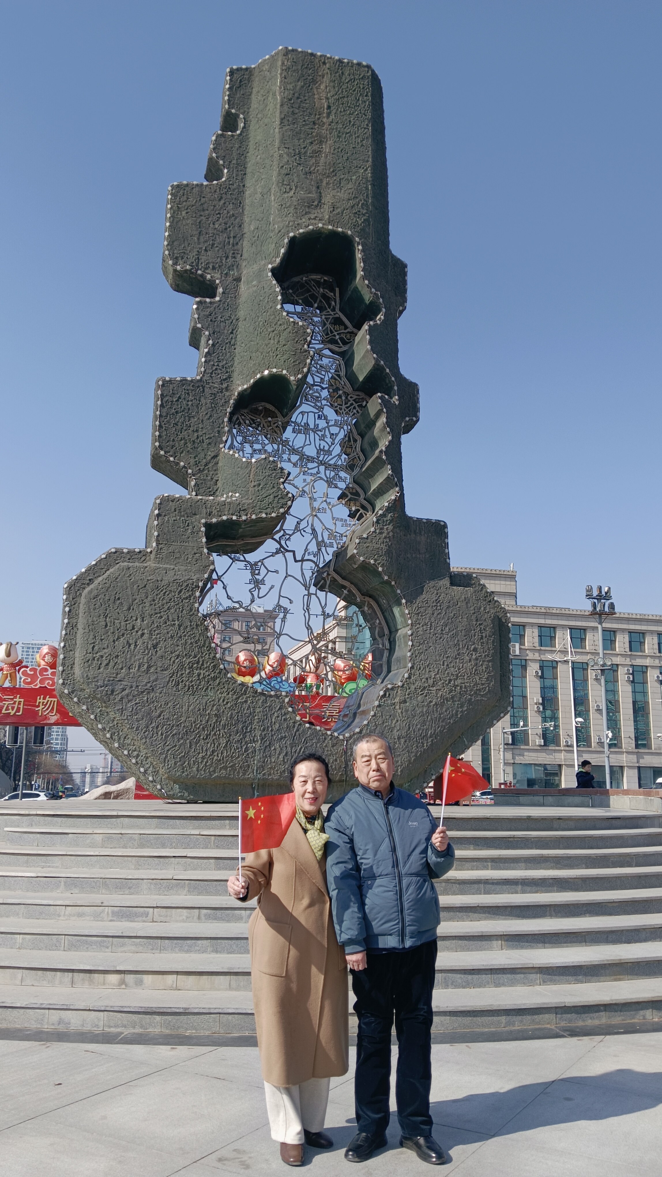 2月19日,鞍山迎来解放78周年纪念日。在以解放日命名的二一九公园正门广场,曾参加过解放鞍山战斗的老兵王中奎的儿子王永刚、儿媳赵丽芳手持国旗,在寓意“开启城市美好未来”的“未来之匙”雕塑前合影留念,用质朴的方式缅怀父辈、铭记烽火岁月,让红色基因在钢都大地上代代相传。