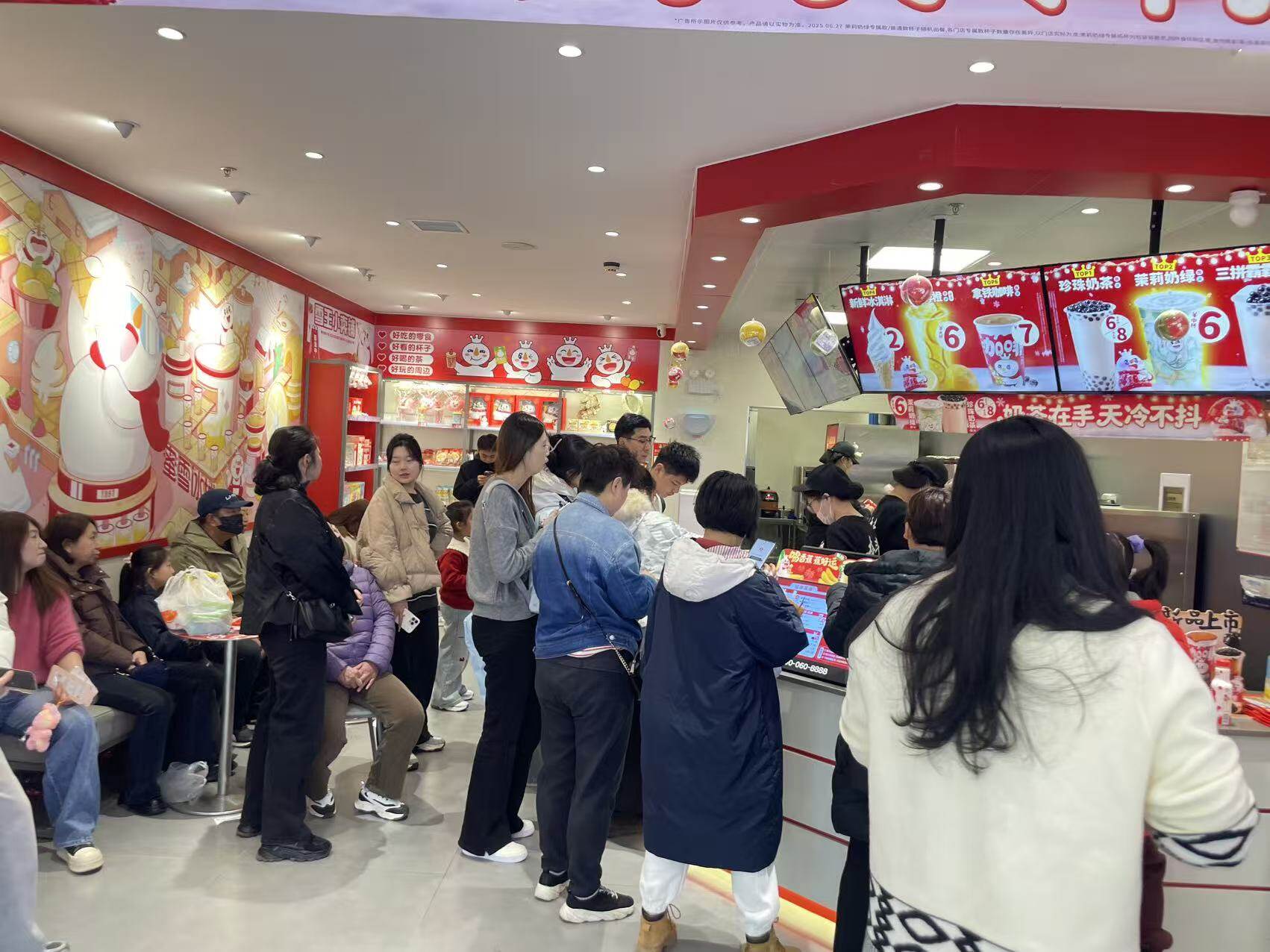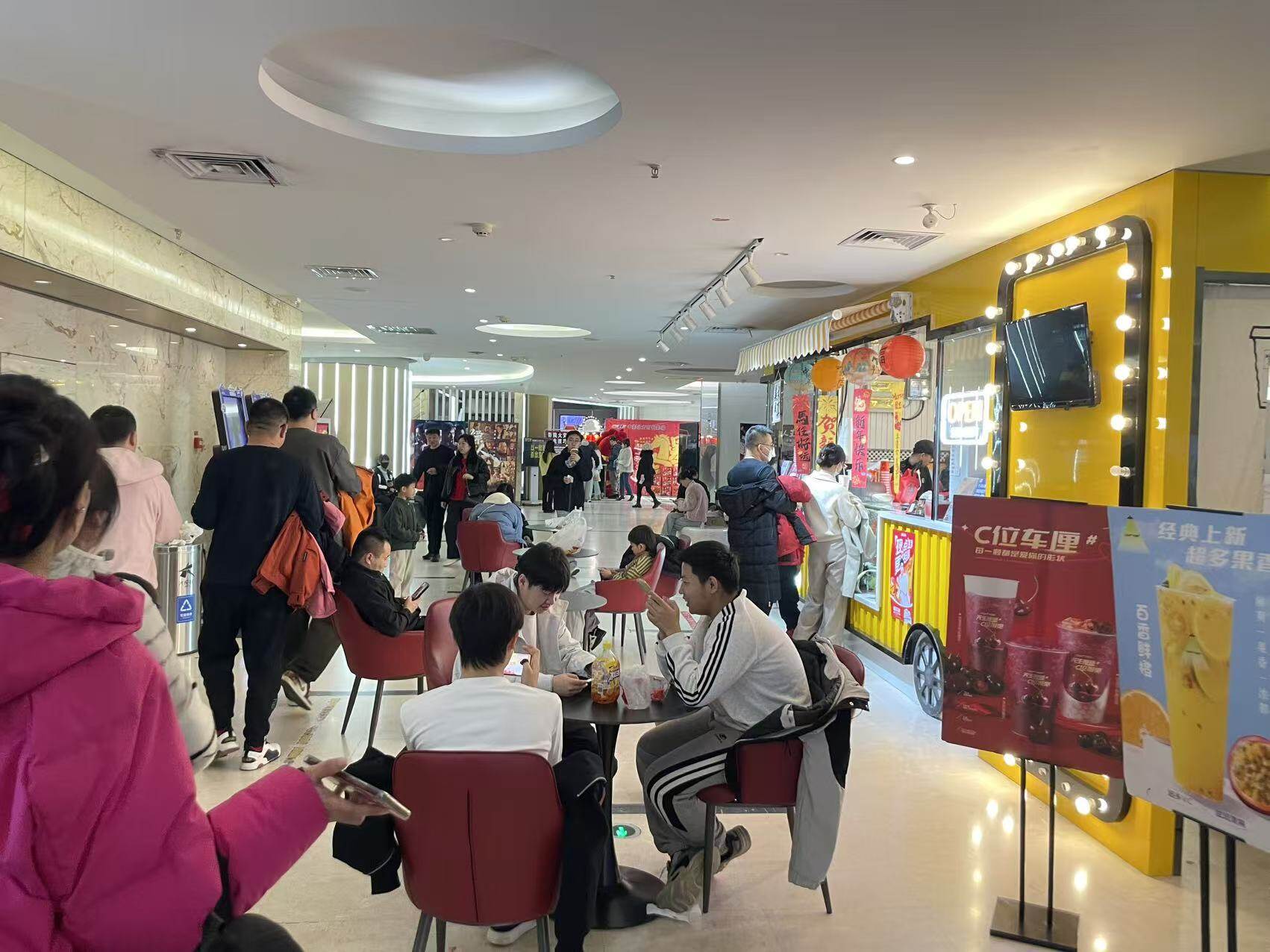 临近中午,商场的餐饮区迎来了一天中最忙的时段。每家店门口都排起了队,有的等位的凳子上坐满了人,手里攥着小票闲聊。涮锅子、烤肉店里的锅气混着香气飘出来,让路过的市民都忍不住向里望一望。