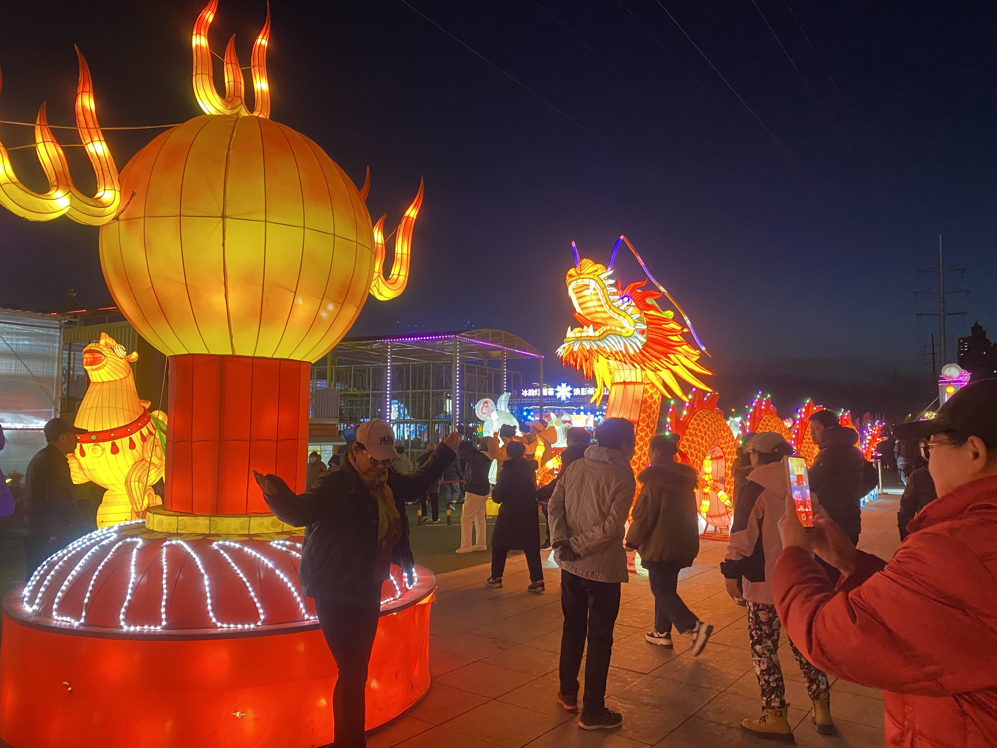 漫步南沙河岸,近百盏来自四川自贡的非遗彩灯沿河铺展,光影倒映水中,交织出如梦似幻的夜色画卷。灯组既有十二生肖、万马奔腾等传统民俗元素,也有象征吉祥如意的凤凰灯组振翅欲飞。据主办方介绍,所有彩灯均为今年最新款,从自贡专项采购,采用非遗扎染工艺结合现代光影技术,让市民在家门口即可沉浸式感受国家级非物质文化遗产的视觉震撼。