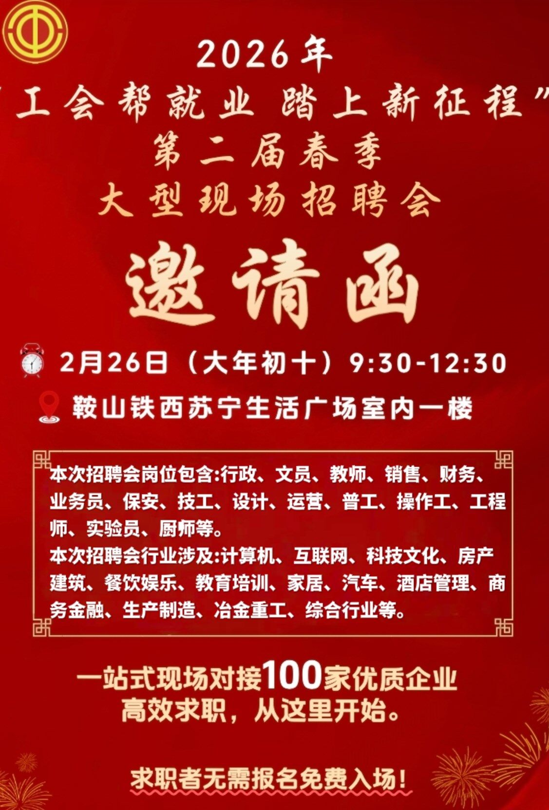 2026年“工会帮就业 踏上新征程”第二届春季大型现场招聘会由市总工会主办,铁西区总工会、市经济开发区总工会、大鞍网@易聘、鞍山苏宁生活广场共同承办。