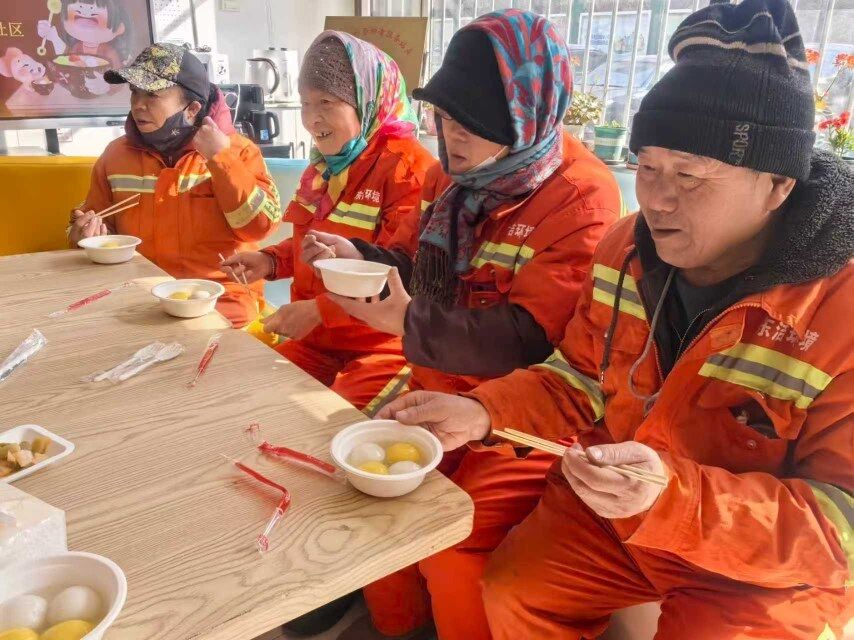 “叔叔阿姨,辛苦了!快来趁热吃碗汤圆!”社区工作人员热情地将一碗碗软糯香甜、热气腾腾的汤圆端到大家手中。“这汤圆真甜,吃在嘴里,暖在心里!”一位环卫工人咬了一口汤圆,脸上露出了朴实的笑容。平日里,他们是街头巷尾最早迎接晨曦的人,此刻,他们放下了疲惫,在社区这个“家”里享受着难得的温馨时光。