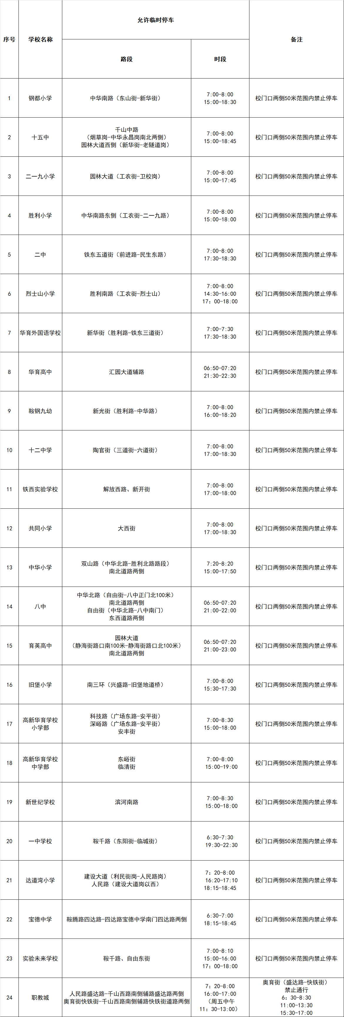 2.上学时段,车辆可在学校周边道路两侧单排顺向停放、即停即走;放学时段,可提前半小时单排顺向停放,请勿双排停车。