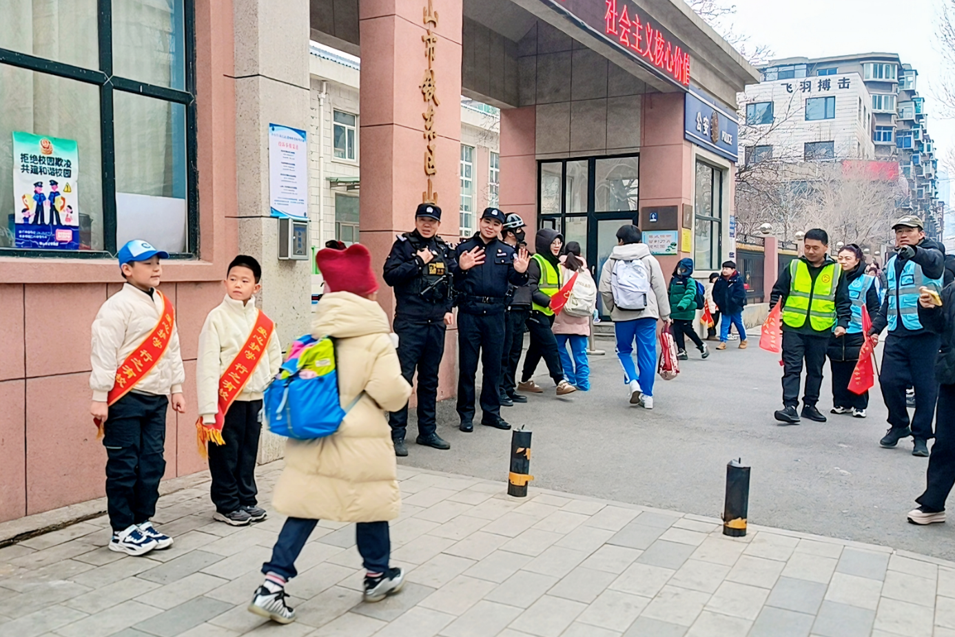 开学第一天,全市中学、小学学校门前,早已站满了一抹抹熟悉的“藏青蓝”与“荧光绿”。面对骤增的车流与人潮,执勤警力提前到岗,采取定点值守与动态穿梭相结合的勤务模式,一边引导接送车辆即停即走、规范停放,一边密切关注周边治安动态。在校门口,他们微笑着与孩子们击掌约定,为新学期加油鼓劲。一声声暖心的问候、一张张灿烂的笑脸,让开学首日的清晨不仅有秩序井然的“安全色”,更洋溢着警民同心的融融暖意。
