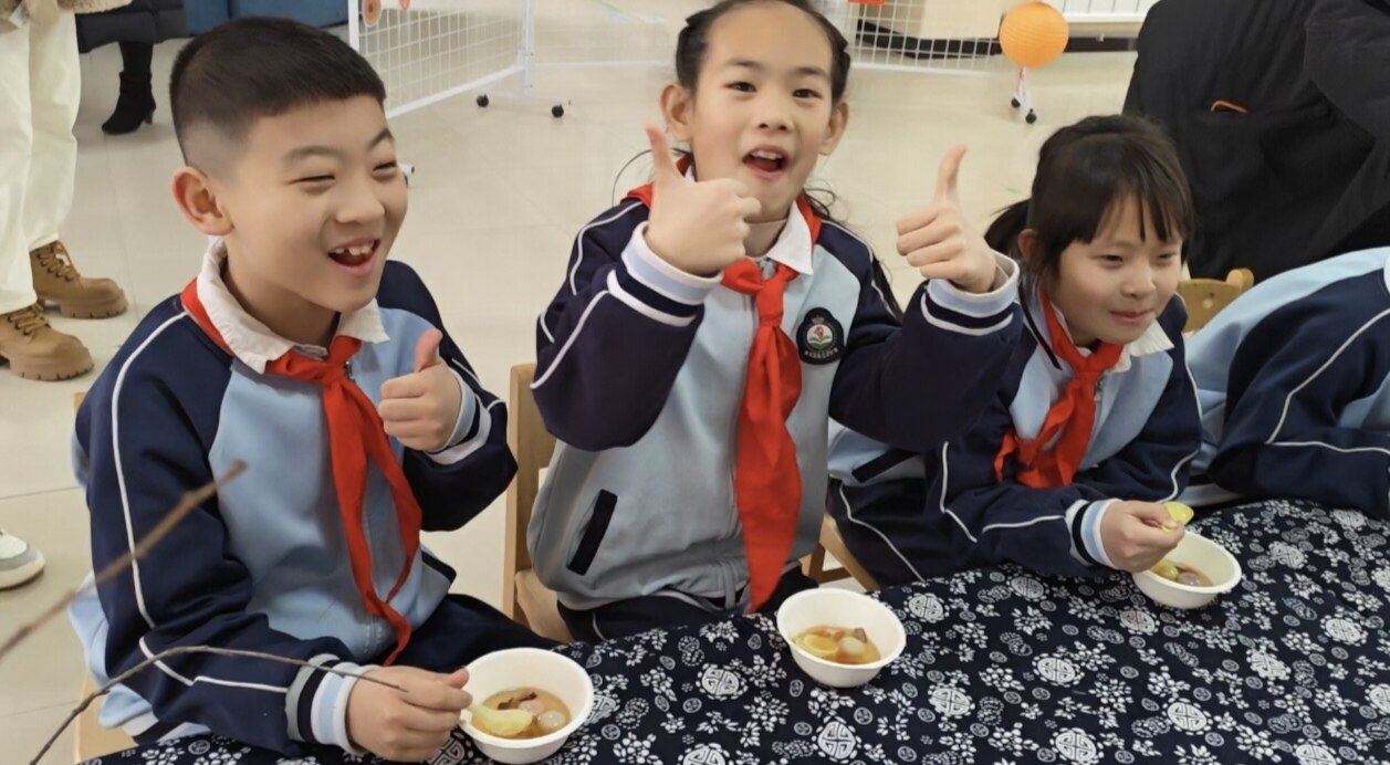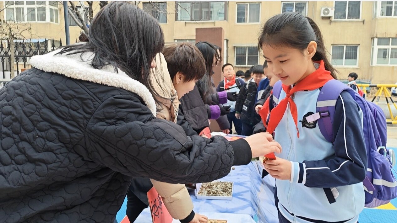 开学首日清晨,记者刚踏入铁西区黎明分校,一股浓郁的“年味”便扑面而来。这里没有传统的开学典礼,取而代之的是一个充满烟火气的“开学吉市”。校园内一条长长的“祝福长廊”成了最热闹的所在。长桌上铺着花布,桂圆、金橘、红枣、花生等象征吉祥如意的瓜果摆放一排。每一份果品旁都贴着精心设计的祝福语:金橘旁写着“大吉大利”,红枣旁是“鸿运当头”,花生旁则是“好事发生”。几位老师正笑盈盈地守在一旁,热情地为学生们分发瓜果。“来,吃颗枣,新学期红红火火!”一位年轻女老师将一颗饱满的红枣递到一位女孩手中,小家伙腼腆地咬了一口,脸上漾开甜甜的笑容。恰逢元宵佳节临近,学校还特意为学生准备了热气腾腾的汤圆。老师们将一碗碗圆滚滚的小汤圆递到孩子们手中。“小心烫,慢慢吃。”一名低年级学生接过小碗,吃了一颗,眯起眼睛咂咂嘴:“真甜!”旁边的同学也跟着笑起来,互相分享着吃汤圆的快乐。这场有滋有味、可触可感的“吉市”体验,让孩子们在舌尖品尝甘甜,在游戏中重温年味,在欢笑中读懂“向上向新”的真意。