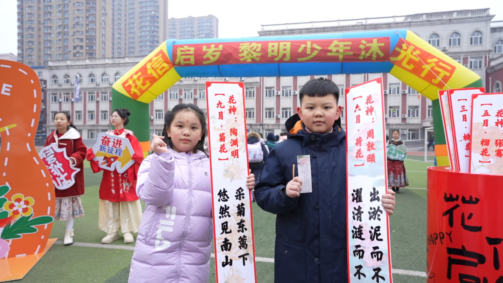 从黎明分校的热闹吉市走出,记者又来到铁西区黎明小学,这里呈现的是另一番诗意景象。清晨入校,校门口最吸睛的当属“十二花神抽签桶”。孩子们入校前都要伸手抽一支“花神签”。一位女生抽到的签上写着“五月榴花,花神张骞。愿你像石榴籽一样团结紧密,在阳光雨露下,积淀出饱满的智慧。”她开心地收好书签,蹦跳着走进校园。大课间时,学生们来到校园正厅,在写满十二花神诗句的长幅前,仔细寻找与自己花神匹配的诗句,并一笔一画地临摹在书签上。墨香与花香仿佛在指尖交融,传统文化的诗意也悄然浸润心田。在随后的开学典礼上,全校学生共同献上灵动的手势舞《立春》,伴着轻快的歌声,少年们宛如春芽破土、花蕾初绽。新学期,全体学生庄严宣誓,许下了“不负春光、沐光前行”的美好誓言。