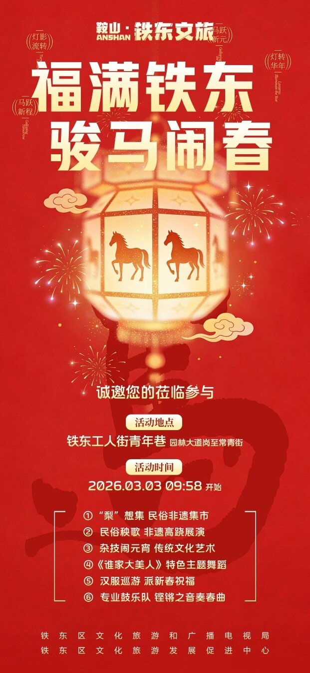 锣鼓敲响,秧歌扭起!3日上午,铁东区将以“福满铁东・骏马闹春”为主题,在工人街青年巷重磅推出元宵节秧歌戏巡游活动。本次活动以传统秧歌戏巡游为核心,融合非遗集市、杂技表演、汉服巡游等多元内容,诚邀广大市民共赴这场沉浸式新春文化盛宴。