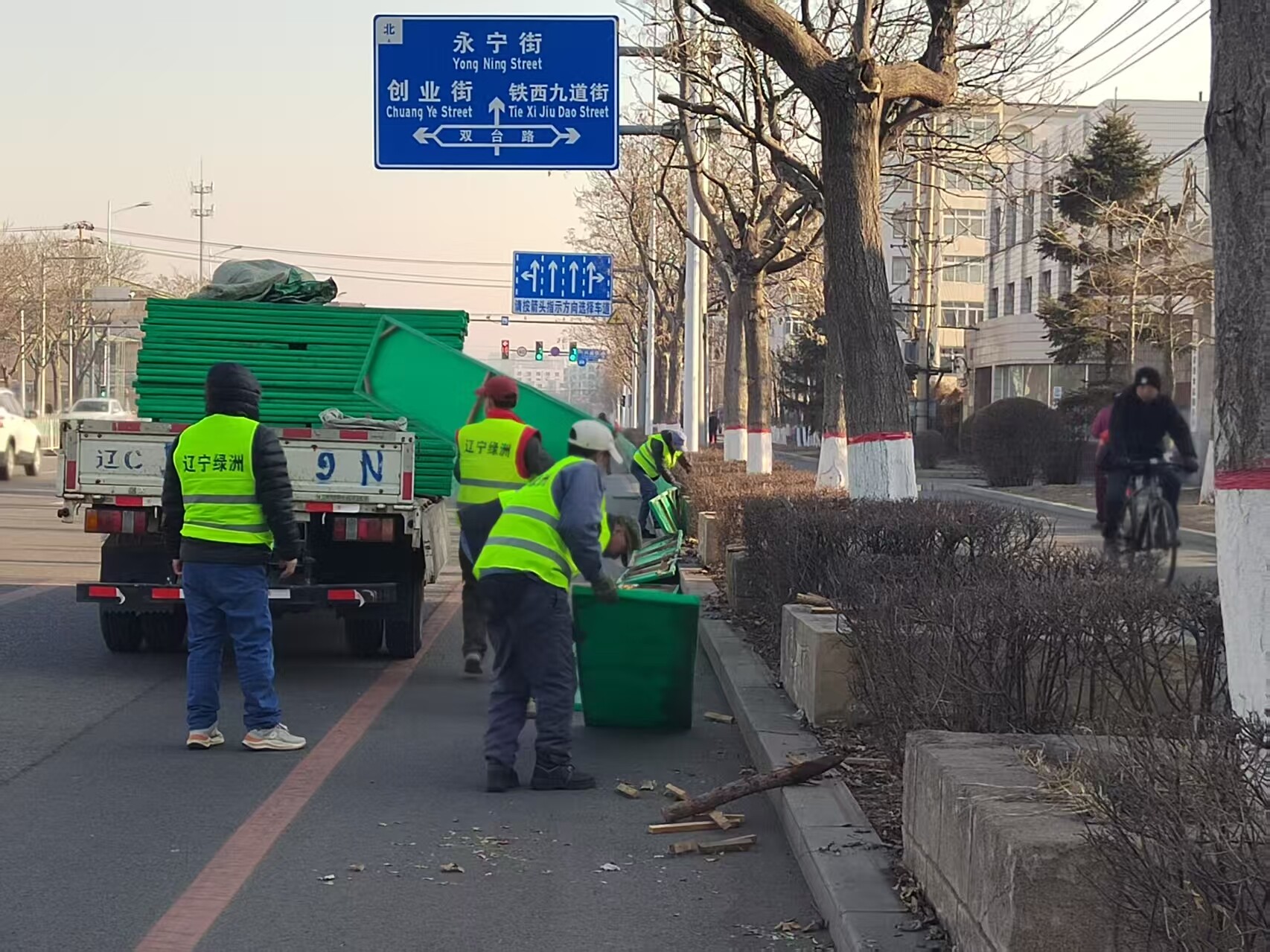 拆帐与清垃圾同步推进,是此次行动的特点。在解放东路绿化带内,养护人员负责拆除防雪帐,环卫人员负责清理枯枝落叶、白色垃圾等。