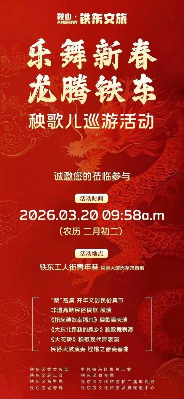 19日,记者获悉,为传承弘扬非遗民俗文化,丰富市民精神生活,铁东区将于3月20日(农历二月初二)举办“乐舞新春 龙腾铁东”秧歌巡游活动。活动以“非遗+民俗+文旅”为核心,将传统秧歌与现代表演形式巧妙融合,诚邀广大市民共赴这场民俗盛宴,感受东北传统秧歌的独特魅力。