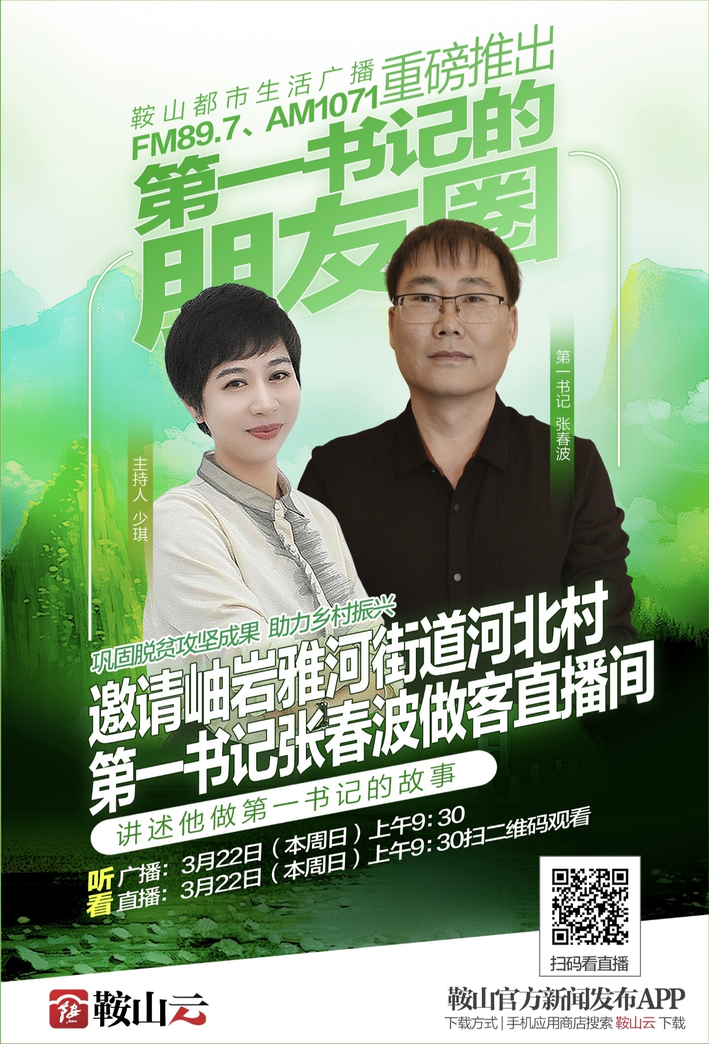 3月22日(本周日)上午9:30鞍山都市生活广播、鞍山云现场直播,欢迎收听收看。