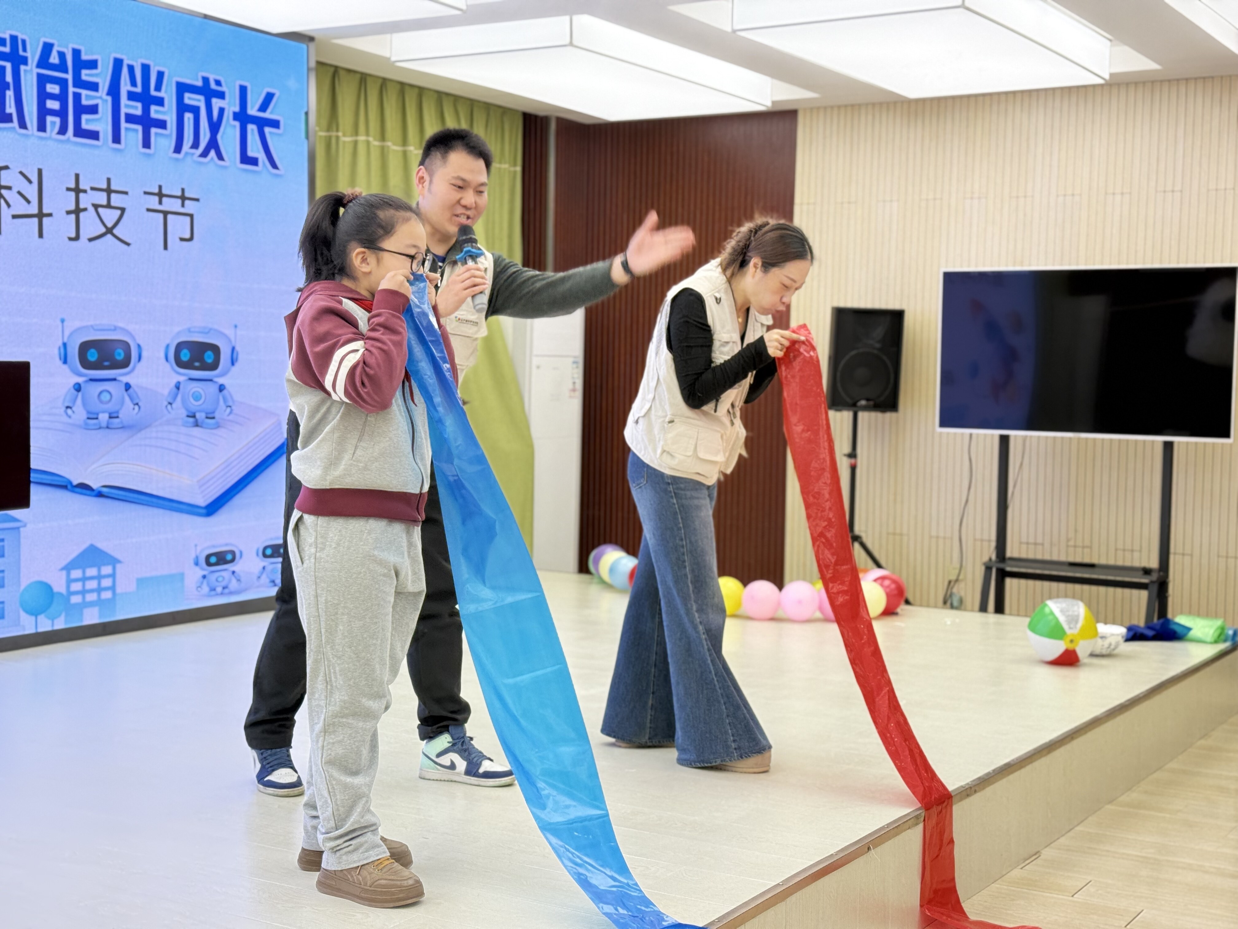 在最受欢迎的科学实验区,科普老师们以伯努利原理为核心,将物理课变成了“魔法课堂”,依次开展了袋子吹鼓、小球悬浮、吹气球三项经典科学演示,用通俗语言拆解原理、用直观操作呈现科学现象。在肺活量挑战实验中,两位同学手持彩色长袋,奋力向袋内吹气,长长的蓝红塑料袋在气流推动下不断延伸,直观展现了肺活量的差异,台下的学生纷纷举手跃跃欲试,眼神里满是好奇与求知的光芒。
