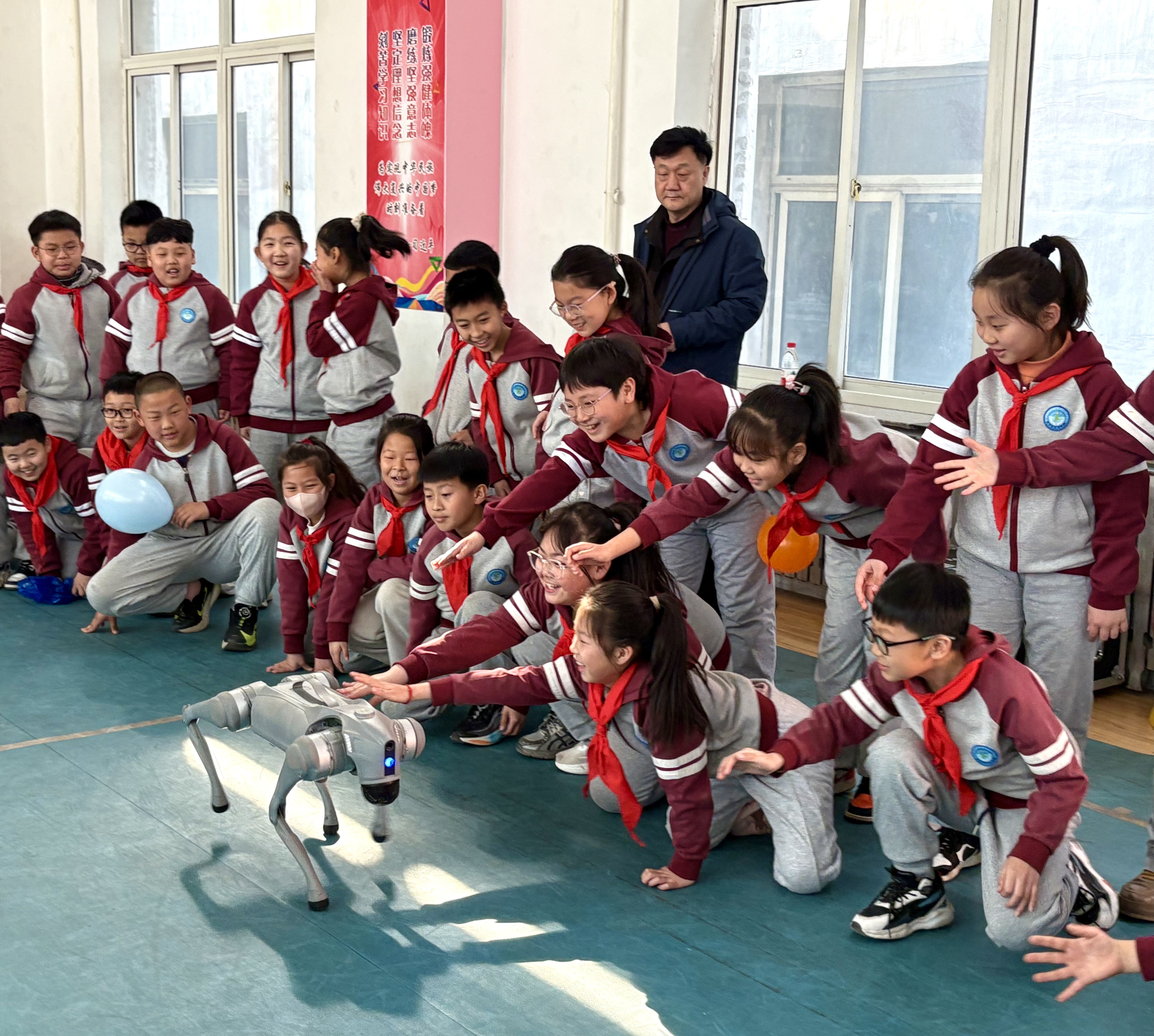 伴随着孩子们的惊呼声,一只灵巧的机器狗在操场上闪亮登场,灵活的后空翻引得掌声雷动。操场上,裸眼3D球幕影院《恐龙灭绝之谜》 正在上演,让孩子们仿佛置身远古丛林,感受科学与视觉的双重震撼。
