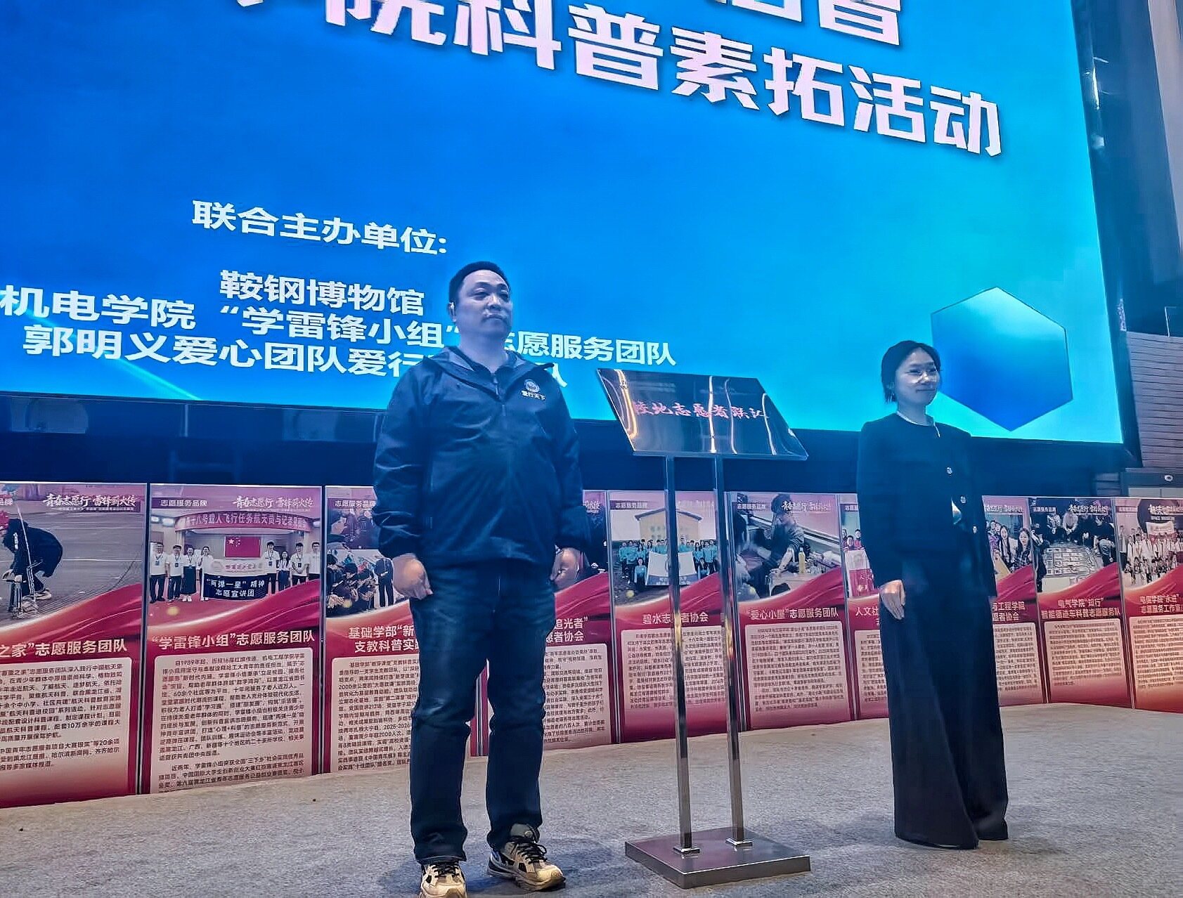 为推动志愿服务常态化、科普教育长效化,活动现场隆重举行共建揭牌仪式,鞍钢博物馆与哈尔滨工业大学机电工程学院团委携手共建“志愿服务工作站”,并促成学院团委与鞍山郭明义爱心团队爱行天下分队联合成立“校地志愿者联队”,凝聚科普宣传与志愿服务强大合力。