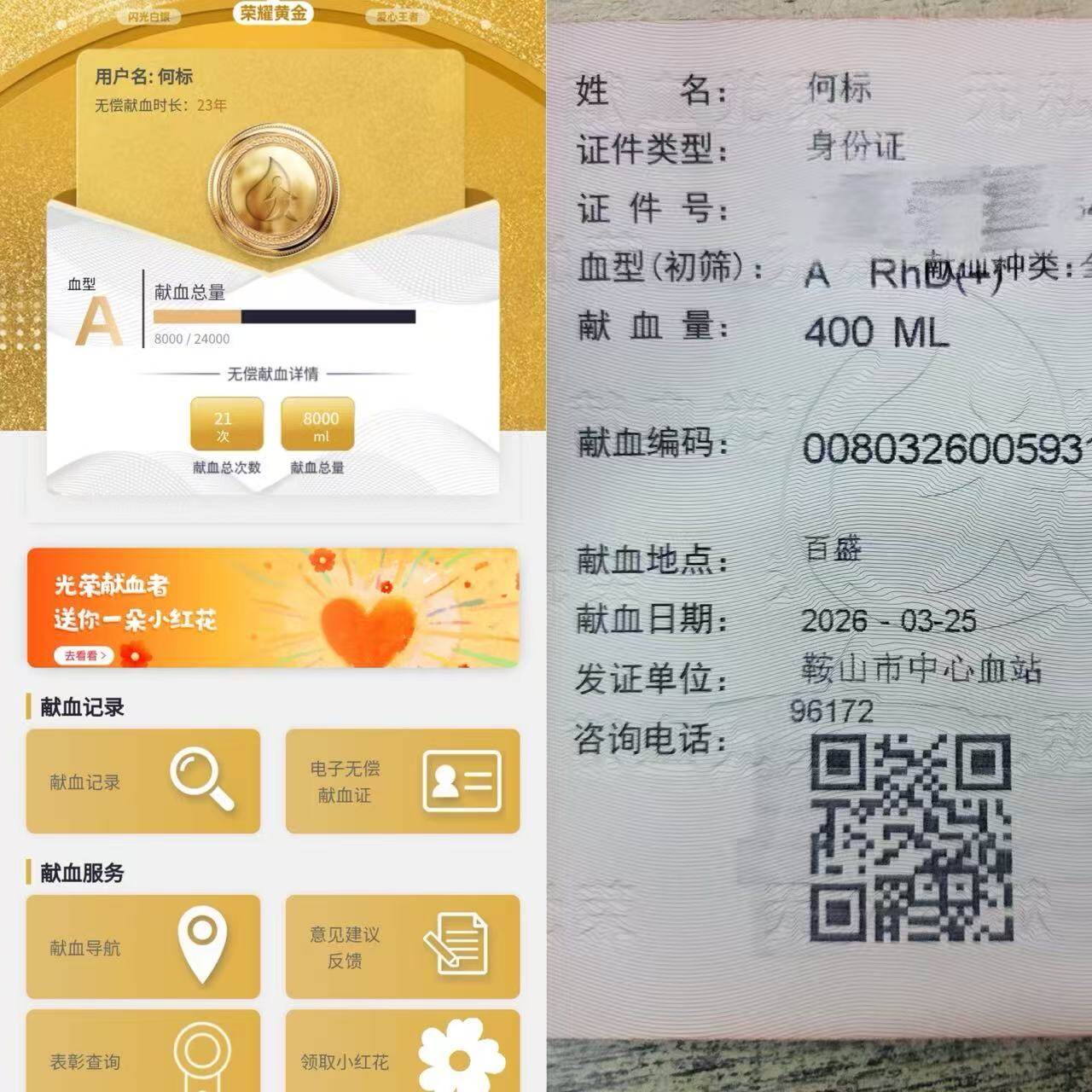 25日,鞍山老干部大学体育舞蹈系主任何标,再次来到百盛附近的献血车,成功捐献400毫升血液。从24岁到47岁,23载初心不改,他累计无偿献血达8000毫升,相当于两个成年人全身血液总量,用日复一日的坚守,荣获全国无偿献血奉献奖金奖,书写了一名普通人对生命最赤诚的守护。