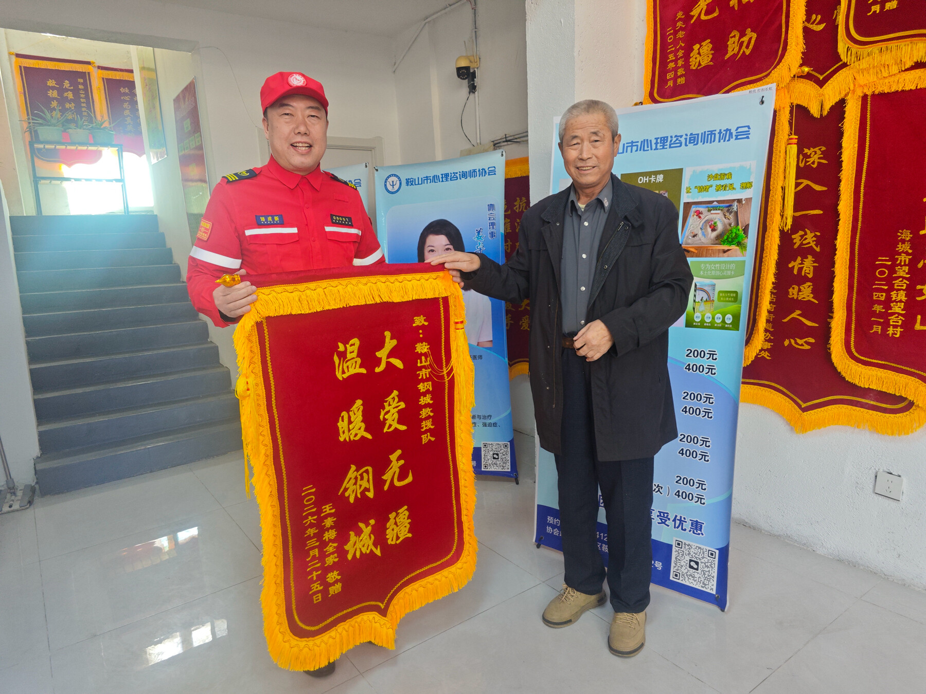 27日上午,走失老人家属再次来到鞍山市钢城救援队队部,将一面写着“大爱无疆 温暖钢城”的锦旗送给矫成新队长,感谢他的团队仅用4个小时就找到了走失老人。