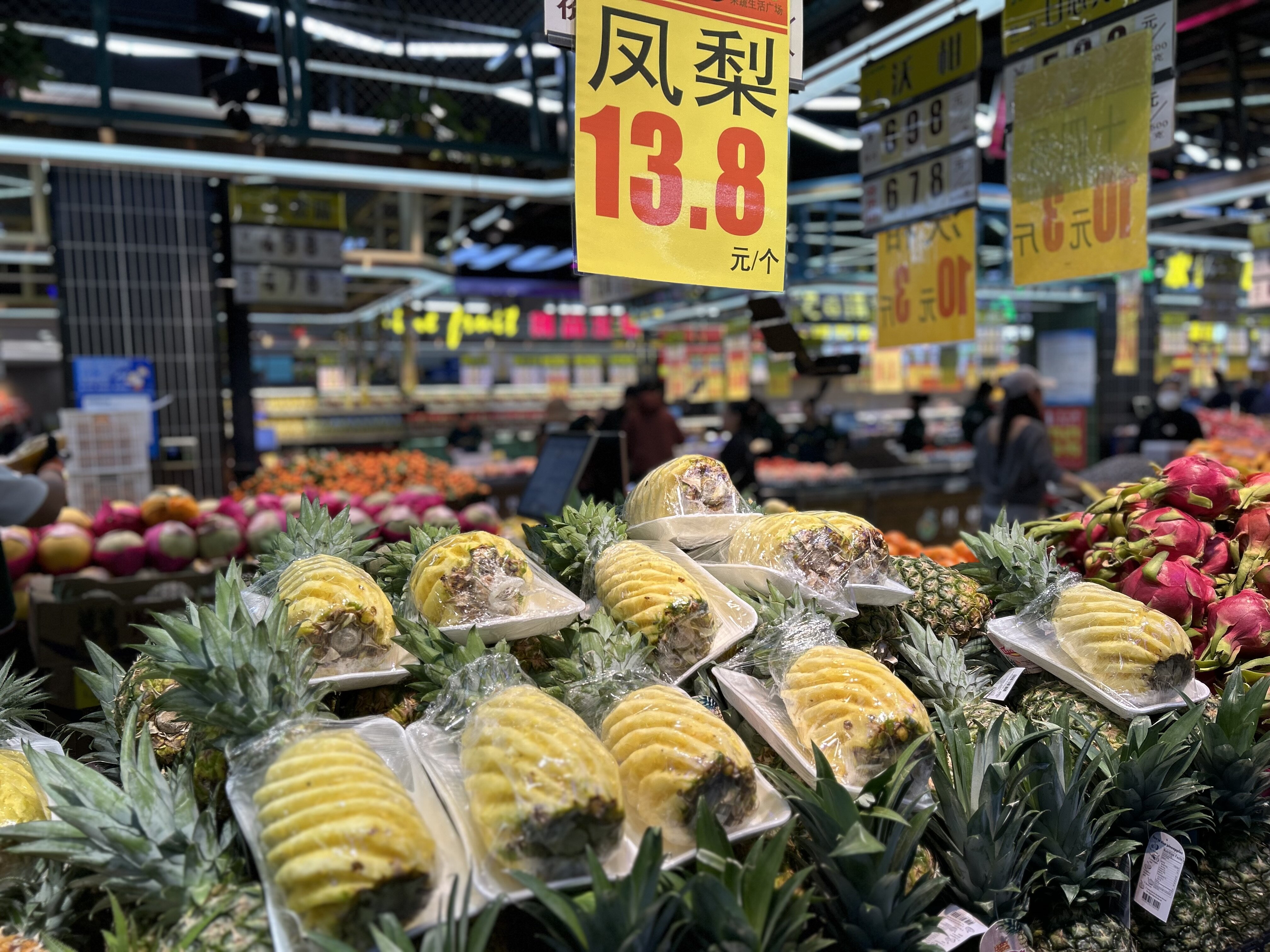 走进立山一家大型生鲜市场的水果专区,一排排削好的凤梨被整齐码放在托盘里,裹着透明保鲜膜,金黄的果肉在灯光下泛着诱人光泽,旁边还堆着带着翠绿冠芽的完整凤梨,果香四溢。醒目的黄色价签上标注着“凤梨13.8元/个”,不少市民驻足挑选,有的直接拿起包装好的即食凤梨放进购物车,有的则端详完整果形,准备买回家自行处理。