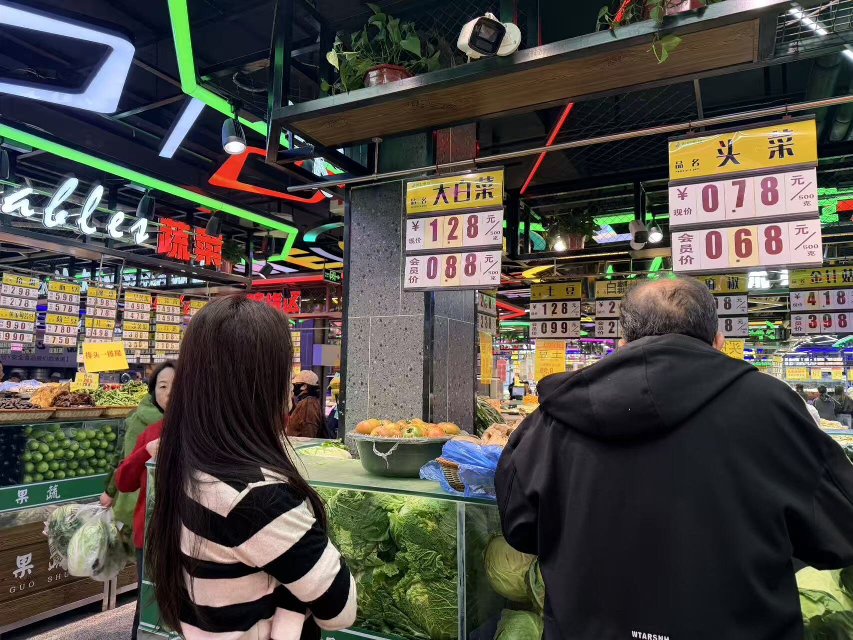 据超市负责人介绍,近期本地露天蔬菜陆续上市,供应量大幅增加,带动了整体菜价回落。“像大白菜、头菜这类耐储存的蔬菜,价格降幅最明显,部分品种较上月下跌超40%。”该负责人表示,为了让利于民,超市还推出了会员专属优惠价,进一步吸引市民采购,“这几天蔬菜区的客流量比之前增长了三成左右,不少市民专门来抢低价菜。”