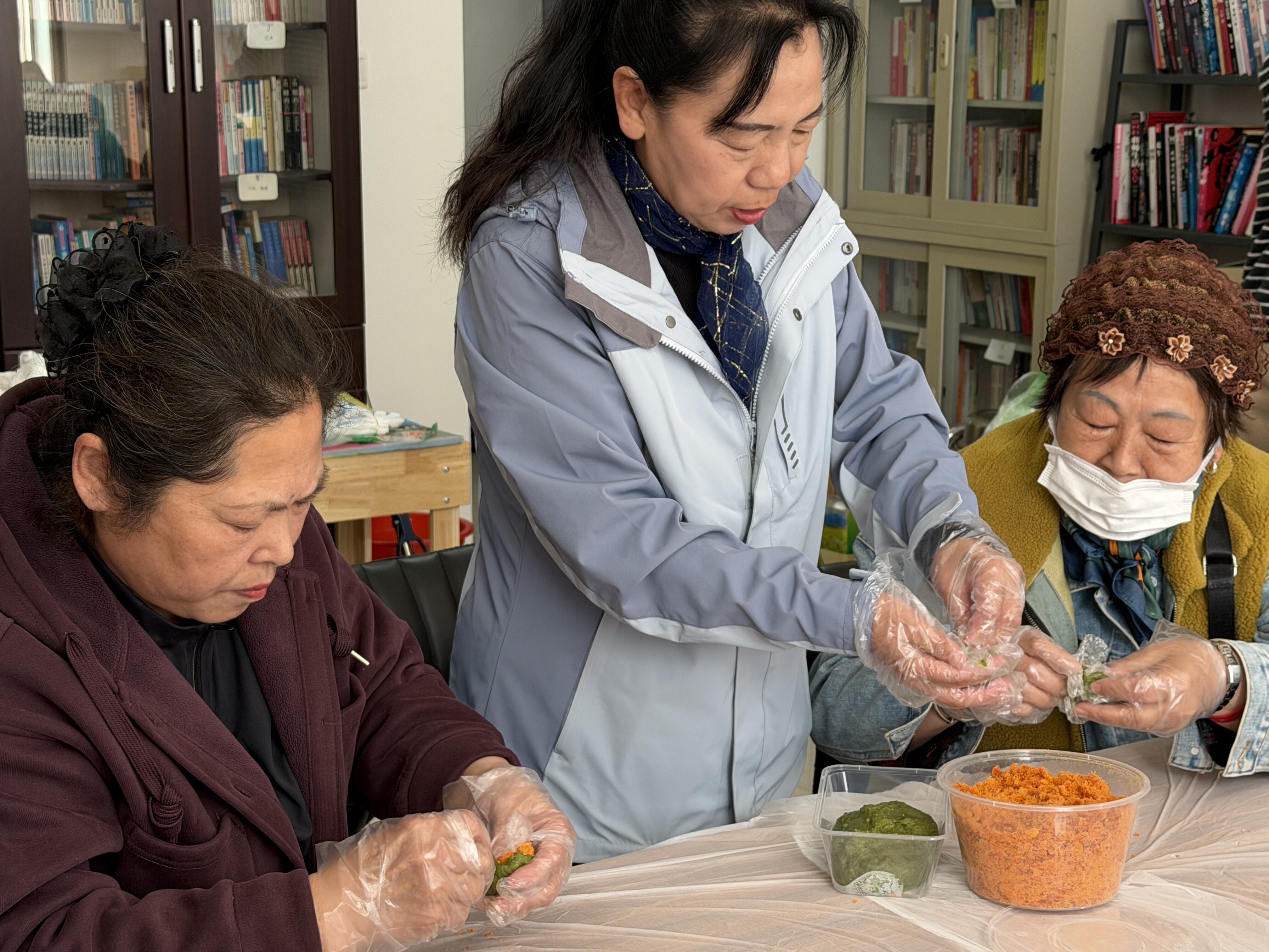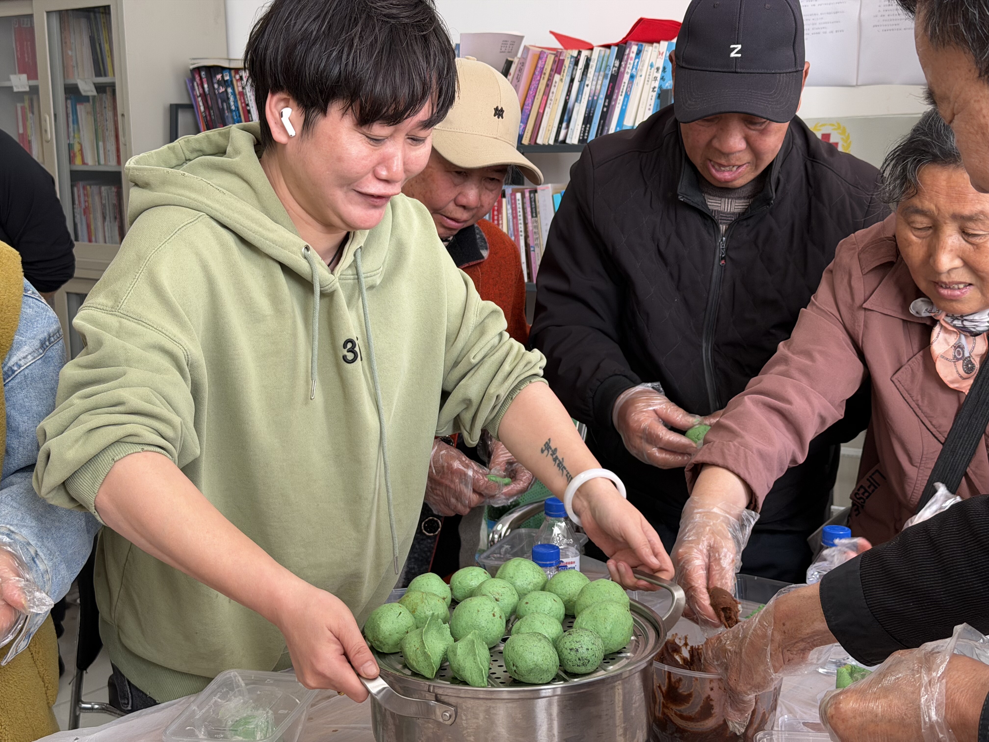 活动现场,长桌上摆满了糯米粉、豆沙馅、艾草汁等材料,大家挽起袖子,一边聊着清明旧俗,一边熟练地揉面、包馅、塑型。不一会儿,一颗颗碧绿饱满的青团便在指尖成型,软糯清香扑面而来。“以前清明都是买青团吃,今天自己动手做,感觉更有‘春的味道’。”一位居民笑着感慨道。