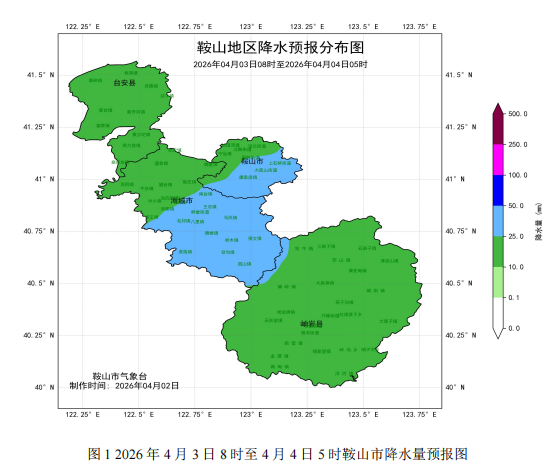 预计4月3日,鞍山市区、海城有中到大雨(15~35毫米),台安和岫岩有中雨(10~25毫米),局部伴有雷电,3日夜间,大部地区有雨夹雪,并伴有大风、降温。