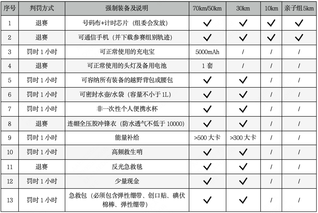 越野赛事赛道环境复杂多变,强制装备是选手应对突发状况、保障自身安全的最后一道防线,更是赛事安全保障的核心环节。组委会郑重告知,赛事期间,将在主会场及赛道中途设置多个强制装备检查点,采取固定检查与临时随机抽查相结合的方式,对选手强制装备携带情况进行全面核查。所有选手务必严格按照赛事强制装备清单准备齐全装备,切勿抱有侥幸心理,确保自身安全参赛,顺利完成挑战。