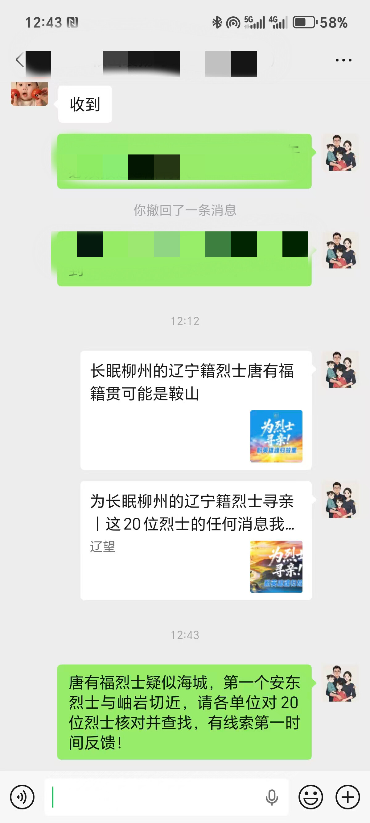 “我们都是军人出身,最懂这份牺牲与坚守。为烈士寻亲,是我们义不容辞的责任!”退役军人任宪伟说。一时间,“唐有福烈士及辽桂联手为烈士寻亲”的消息在鞍山大街小巷传播,令辽桂联手为烈士寻亲的消息形成刷屏之势。
